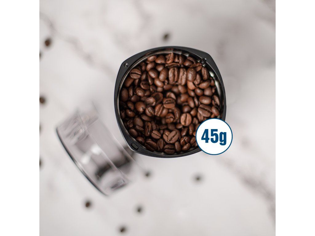 Elektrický mlynček na zrnkovú kávu. Zásobník na 45 g kávových zŕn. Hrúbka namletej kávy záleží od dĺžky mletia. Bezpečnostná poistka proti spusteniu mlynčeka bez krytu. Nôž z ušľachtilej ocele. Jednoduchá obsluha. Napájanie: 220 - 240V~ 50/60Hz, 180 W.Dodatočné parametre