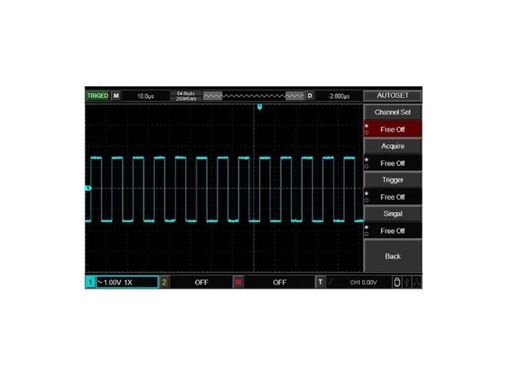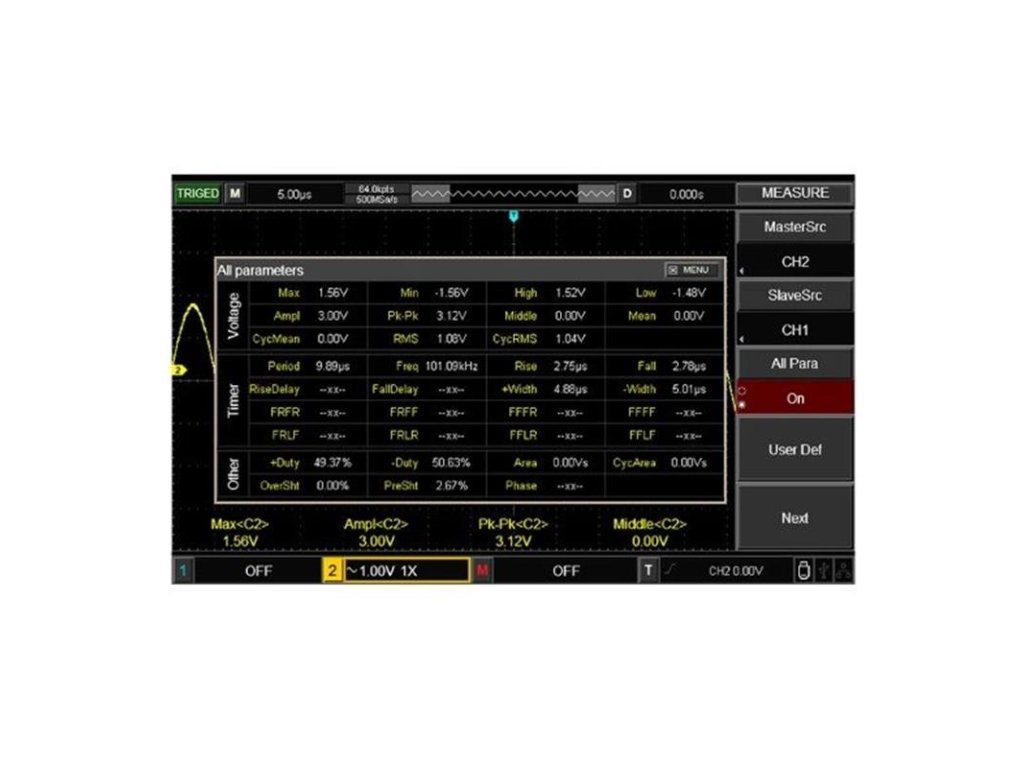 • Automatické měření parametrů signálu: Max, Min, High, Low, Middle, Pk-Pk, Ample, Mean, Cycle Mean, RMS, Cycle RMS, Area, Cycle Area, OverShoot, PreShoot, Period, Freq, Rise, Fall, +Width, -Width, +Duty, -Duty, RiseDelay, FallDelay, Phase, FRFR, FRFF, FFFR, FFFF, FRLF, FRLR, FFLR, FFLF