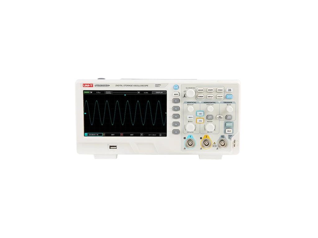 Osciloskop UTD2202CEX+ je kvalitativně nejvyšší typ stolního digitálního osciloskopu ze série UTD2000CEX+. Je to multifunkční, vysoce výkonný osciloskop, který je snadno ovladatelný s velmi dobrými technickými specifikacemi, s dvěma analogovými vstupními kanály, který nabízí šířku pásma 200 MHz se vzorkováním 1 GS/s. Je vybaven sedmipalcovým barevným TFT displejem s rozlišením 800 x 480 pixelů.