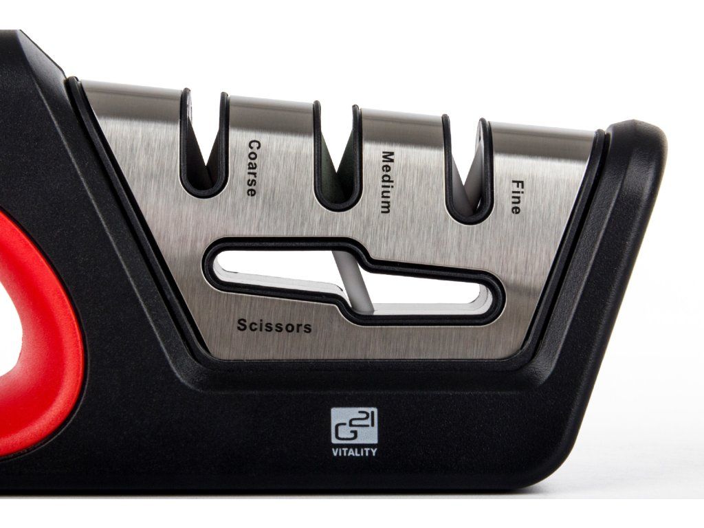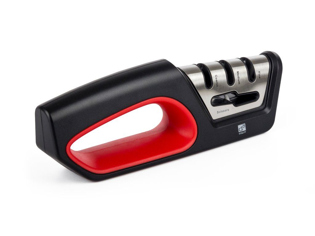 Multifunkčný trojstupňový ostrič nožov a nožníc je z odolného materiálu, s ergonomicky tvarovaným telom a protišmykovým dnom. Jeho použitie je preto ľahké a bezpečné.
