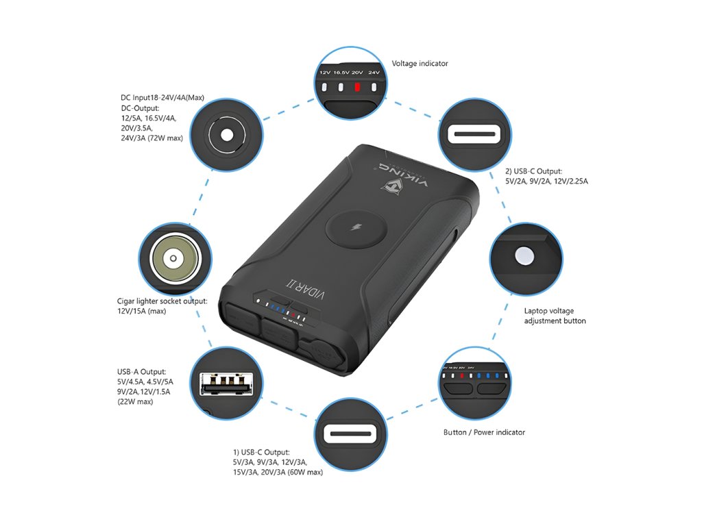 Outdoorová powerbanka Viking VIDAR II • Kapacita: 72000mAh/266.4Wh • Maximální výkon: 180W • Zabudované LED světlo • Široká škála vstupů a výstupů (USB-A, USB-C, Cigaretová zásuvka, DC-jack, WIRELESS Qi) • Možnost solárního napájení • Funkce Pass-Through • Odolnost IP65 Outdoorová powerbanka Viking VIDAR II Outdoorová powerbanka Viking VIDAR II je praktická a odolná powerbanka, která nabízí ideální kombinaci výkonu, kapacity a přenosnosti. Díky robustní konstrukci, vestavěné LED svítilně a širokému výběru výstupních konektorů je ideální pro kempování, práci v terénu i každodenní použití. S kapacitou 72000 mAh (266.4Wh) a maximálním výkonem až 180 W spolehlivě napájí širokou škálu zařízení – od mobilních telefonů přes notebooky až po 12V spotřebiče. Nabízí výstupy USB-A, USB-C (2x), DC-JACK pro notebooky, cigaretovou zásuvku a navíc i bezdrátové nabíjení WIRELESS (Qi). Klíčové vlastnosti: • Kapacita baterie 72000 mAh (266.4Wh) • Rychlé nabíjení přes USB-C nebo DC-JACK (nabíjecí výkon až 70 W) • Wireless bezdrátové nabíjení (10 W) • Fukce Pass-Through umožňuje současné nabíjení i používání powerbanky • Powerbanku lze nabít solárním panelem o výkonu až 80 W • Možnosti nastavení výstupního napětí • Ideální pro napájení mobilů, tabletů notebooků a další běžné elektroniky • Díky zabudovanému LED světlu poslouží i jako nouzová svítilna • Hmotnost cca 1,5 kg a praktické rozměry pro snadný transport Spolehlivý zdroj energie na každém kroku Powerbanka Viking VIDAR II je spolehlivý pomocník pro každého, kdo potřebuje mít energii vždy po ruce – ať už na vícedenním kempování, při práci v terénu nebo na cestách. S kapacitou 72000?mAh, kompaktními rozměry a širokým výběrem výstupů pohodlně nabijete více zařízení současně – od mobilních telefonů přes notebooky až po 12V spotřebiče. O stavu baterie máte přehled díky čtyřem modrým LED diodám, které ukazují zbývající kapacitu. Nechybí ani praktická LED svítilna, která se hodí v noci i při nouzových situacích. Powerbanka podporuje funkci pass-through, díky které můžete zároveň nabíjet samotnou powerbanku a zároveň napájet připojená zařízení – ideální při použití se solárním panelem nebo během delšího pobytu mimo síť. Výkon a konektivita bez kompromisů Pro pohodlné a univerzální použití je powerbanka vybavena širokou škálou výstupních konektorů, díky kterým snadno nabijete různé typy zařízení – od mobilních telefonů až po běžnou elektroniku. Výstupy: • Cigaretová zásuvka: 12V/15A (max) • USB-A: 5V/4.5A, 4.5V/5A, 9V/2A, 12V/1.5A (22W max) • USB-C : 5V/3A, 9V/3A, 12V/3A, 15V/3A, 20V/3A (60W max) • USB-C : 5V/2A, 9V/2A, 12V/2.25A • DC-JACK (5.5/2.1mm): 12/5A, 16.5V/4A, 20V/3.5A, 24V/3A (72W max) • WIRELESS (Qi): 10W Rychlé a spolehlivé dobíjení doma i venku Dobíjení powerbanky je rychlé a flexibilní díky několika dostupným vstupům, které umožňují nabíjet zařízení jak ze sítě, tak například ze solárního panelu – ideální pro použití doma i v terénu. Vstupy: DC Input (5.5/2.1mm): 18-24V/4A(Max) Solární nabíjení (JACK): 80W (max) USB-C: 5V/3A, 9V/3A, 12V/3A, 15V/3A, 20V/3A Odolná a výkonná powerbanka Tato powerbanka je navržena s ohledem na extrémní podmínky. Díky certifikaci IP65 je odolná proti prachu a stříkající vodě, takže se nemusíte obávat, že by ji poškodila prachová bouře nebo lehký liják. Powerbanka je také vybavena LED svítilnou, která vám poskytne osvětlení v případech nouze nebo v situacích, kdy potřebujete dodatečné světlo. Také můžete aktivovat nouzové červené světlo. Může být užitečná při táboření, nočních výletech nebo jednoduše při hledání něčeho ve tmě. Obsah balení: 1 ks Powerbanka Viking VIDAR II 1 ks Ochranné pouzdro 1 ks Adaptér pro nabíjení ze sítě (koncovka DC-JACK 5.5/2.1mm, evropská zástrčka) 1 ks Propojovací kabel s JACK koncovkami (5.5/2.1mm) 1 ks Propojovací kabel USB-A – USB-C 1 ks Propojovací kabel USB-C – USB-C Sada 8 různých koncovek/přechodek pro nabíjení notebooků Technické specifikace: Model: Viking VIDAR II Baterie: Kapacita: 72000mAh/266.4Wh Napětí baterie: 3.7V Typ: Li-pol Vstupy: DC Input (5.5/2.1mm): 18-24V/4A(Max) Solární nabíjení: (JACK) 80W (max) USB-C: 5V/3A, 9V/3A, 12V/3A, 15V/3A, 20V/3A Výstupy: Cigaretová zásuvka: 12V/15A (max) USB-A: 5V/4.5A, 4.5V/5A, 9V/2A, 12V/1.5A (22W max) USB-C: 5V/3A, 9V/3A, 12V/3A, 15V/3A, 20V/3A (60W max) USB-C: 5V/2A, 9V/2A, 12V/2.25A DC-JACK (5.5/2.1mm): 12/5A, 16.5V/4A, 20V/3.5A, 24V/3A (72W max) WIRELESS (Qi): 10W Ostatní specifikace: Rozměry: 230 x 125 x 44 mm Hmotnost: 1,56 kg Materiál: ABS + PC IP ochrana: IP65 (platí pouze v případě, že jsou všechny vstupní i výstupní konektory zakryté např. silikonovým ochranným krytem) Certifikace: CE, RoHS, MSDS, CE, UN38.3 COMPLIANT Příslušenství: AC nabíjecí adaptér, propojovací kabel JACK - JACK, propojovací kabel USB-C-USB-C, propojovací kabel USB-A-USB-C, sada 8 redukcí JACK, ochranné pouzdro Funkce: LED indikátory stavu nabití, LED světlo, Pass-Through Provozní teplota: 0°C ~ 45°CDodatočné parametre