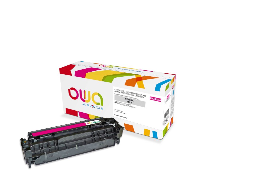 Alternativní purpurový laserový toner značky Armor s kapacitou 2700 stran pro tiskárnu HP LJ M476. V případě, že máte nejasnosti ohledně kompatibility, obraťte se prosím na bezplatnou infolinku 800 157 928. Další informace na www.armor.cz Tonery OWA ARMOR – řešení pro zodpovědné Tonery OWA ARMOR – Unikátní kombinace ekonomického a ekologického řešení • Velmi kvalitní řada tonerových kazet OWA ARMOR do téměř všech tiskáren na trhu. • Na všechny tonery OWA ARMOR je poskytován bezkonkurenční servis v podobě doživotní záruky na kazety, převzetí záruky za nové tiskárny a zpětný odběr kazet. • ARMOR ručí za kvalitu tisku. • Žádný z tonerů OWA ARMOR neporušuje patentové právo. • Tonery OWA ARMOR vám umožňují splnit požadavky společenské odpovědnosti firem (CSR) v oblasti ochrany životního prostředí. • Při zapojení se do programu OWA získáváte automaticky tzv. Materiálový report, který můžete zahrnout do vašeho CSR reportu. Podívejte se, jak program OWA funguje https://www.youtube.com/watch?v=oLTvCXQd2jU S tonery OWA Armor zároveň získáváte: • ZDARMA zapojení do programu odběru vypsaných tonerů včetně získání tzv. materiálového reportu – šetříte životní prostředí. • ZDARMA technickou podporu na zákaznické lince 800 157 928. • ZDARMA 100% servis v podobě sítě specializovaných firem s operativním výjezdem technika na místo do 48 hodin. • ZDARMA širokou marketingovou podporu pro partnery • Jistotu, že žádné tonery OWA ARMOR neporušují patenty a jsou zdravotně nezávadné. • Francouzskou kvalitu prověřenou mezinárodními certifikáty. • Doživotní záruku na tonery OWA ARMOR. • Záruku na nové tiskárny.Dodatočné parametre