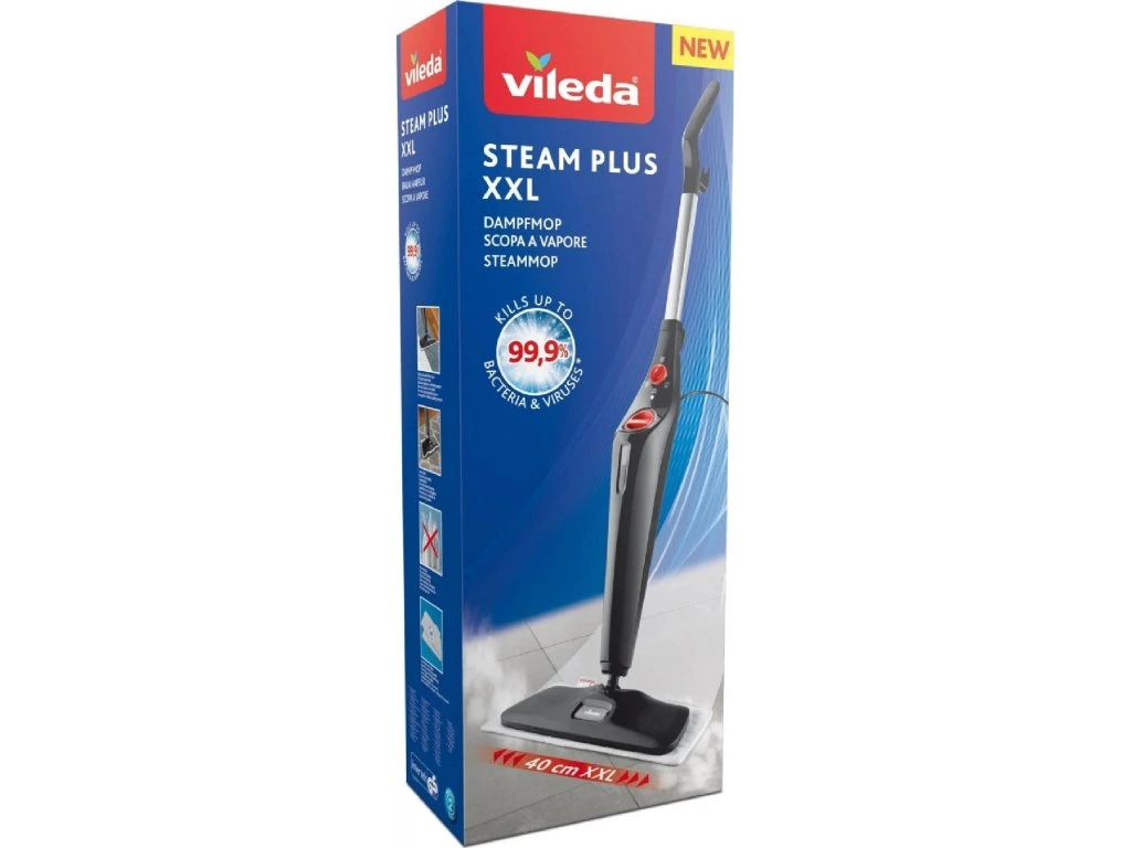 Parný mop VILEDA Steam Plus XXL zabíja až 99,9% baktérií a vírusov Jednoduché používanie parného mopu Vileda Steam Plus XXL Ľahká konštrukcia mopu uľahčí prenášanie po domácnosti. Otočná hlava umožňuje ľahké manévrovanie - dokonca aj pod nábytkom. Vďaka novej rukoväti a podlahovému rámu je parný mop ľahko ovládateľný . Ponúka tri praktické preddefinované nastavenia pary pre parkety, koberce a dlaždice . Vileda Steam Plus jednoducho rozložíte a schováte do malých priestorov či skríň. Veľmi účinné upratovanie s parným mopom Vileda Steam Plus XXL Upratovanie horúcou parou je jedným z najefektívnejších spôsobov údržby, zabíja až 99,9% baktérií a vírusov.* Mop je vybavený dvoma vysoko absorpčnými mikrovláknovými návlekmi a špeciálnym nástavcom na koberce. Tieto návleky je možné tiež zakúpiť samostatne. S parným mopom VILEDA Steam Plus XXL ľahko udržíte podlahu v dokonalej čistote. *Testované na baktérii E. Coli a modifikovanom víruse Vaccinia Ankara (MVA) s 1 minútovým postupom po naparovaní (viď návod).