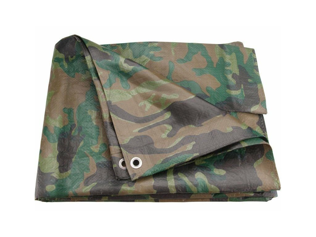 Zesílená PE krycí plachta s kamuflážním vzorem se zvýšenou odolností proti UV záření a povětrnostním vlivům, s oboustrannou laminací a zesílenými okraji. Aluminiová oka každých 100cm s ochranou proti korozi. Odchylka od udávaného rozměru max. 15cm.