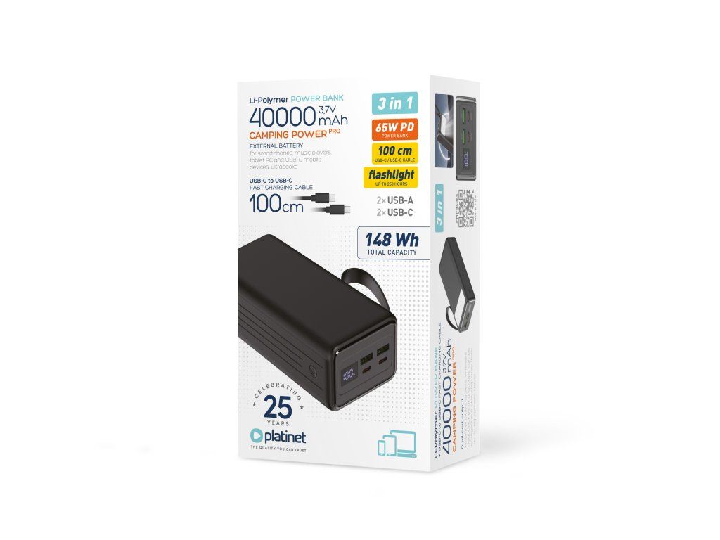 Platinet Powerbanka 40000 mAh 65W Power Delivery, 2xUSB-C, 2xUSB-A, kábel USB-C 1m, čierna
