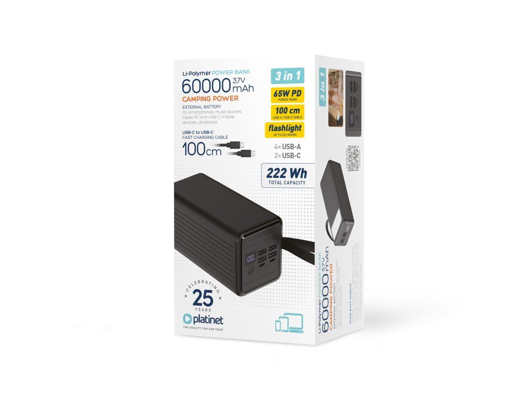 Platinet Powerbanka 60000 mAh 65W Power Delivery, 2xUSB-C, 2xUSB-A, kábel USB-C 1m, čierna