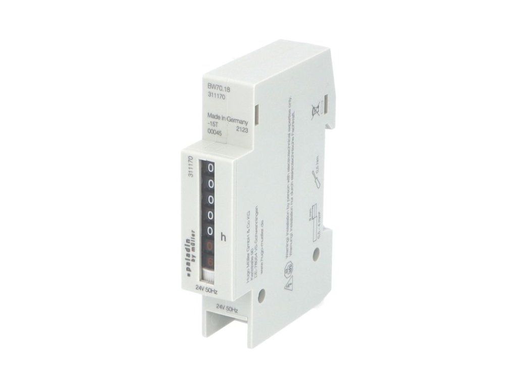 Počítadlo provozních hodin PALADIN 311170 (BW 70.18) - napětí 24V, 50Hz, velikost číslic 2,6mm, kapacita hodin 99999, 1 modulové, montáž na DIN lištu, krytí IP50, barva šedá. Neodmyslitelným pomocníkem k hlídání pravidelných revizí a kontrol zejména průmyslových zařízení jsou počítadla provozních hodin PALADIN a ORBIS. Bezpečně načítají čas provozu zařízení a tím zajišťují delší životnost všech mechanických prvků. Instalují se přímo do panelu nebo na nosnou lištu 35 mm. Počítadla nelze vynulovat. Standardně jsou pro napětí: 230 V AC, 24 V AC a 12-48 V DC. Na vyžádání jsou dostupné i atypické varianty.Dodatočné parametre