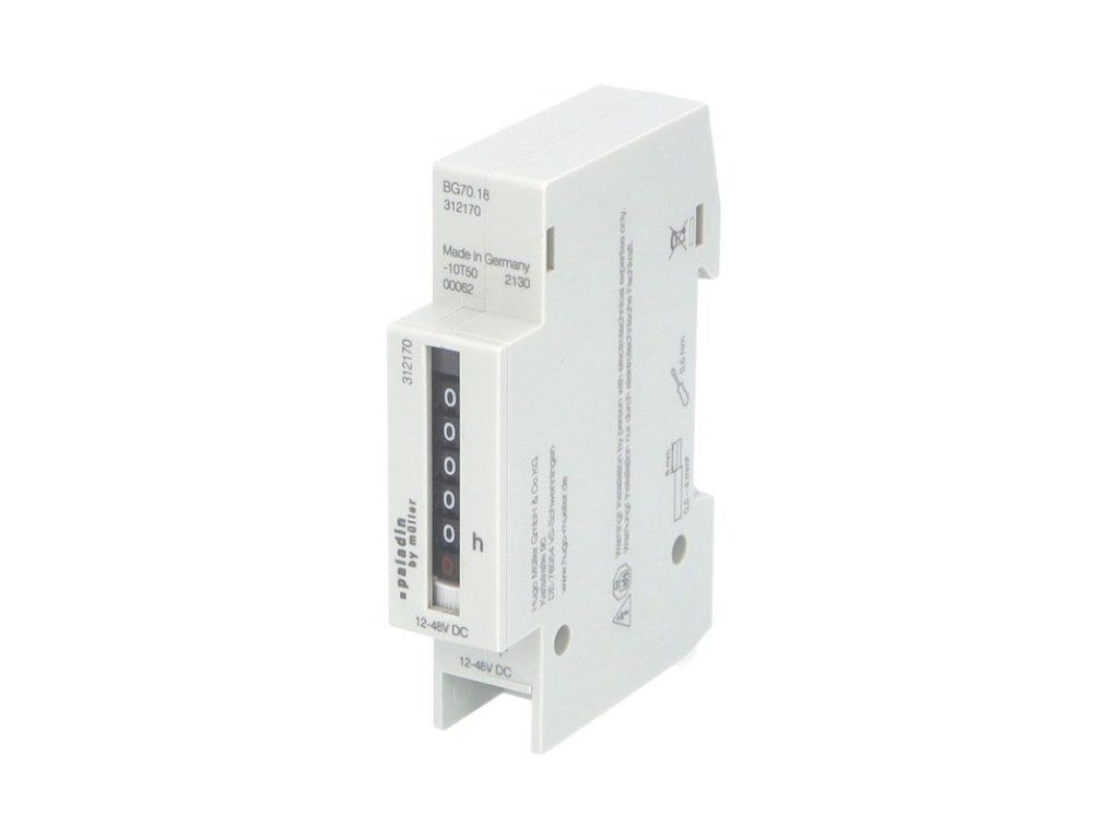 Počítadlo provozních hodin PALADIN 312170 (BG 70.18) - napětí 12-48V DC, velikost číslic 2,6mm, kapacita hodin 99999, 1 modulové, montáž na DIN lištu, krytí IP50, barva šedá. Neodmyslitelným pomocníkem k hlídání pravidelných revizí a kontrol zejména průmyslových zařízení jsou počítadla provozních hodin PALADIN a ORBIS. Bezpečně načítají čas provozu zařízení a tím zajišťují delší životnost všech mechanických prvků. Instalují se přímo do panelu nebo na nosnou lištu 35 mm. Počítadla nelze vynulovat. Standardně jsou pro napětí: 230 V AC, 24 V AC a 12-48 V DC. Na vyžádání jsou dostupné i atypické varianty.Dodatočné parametre