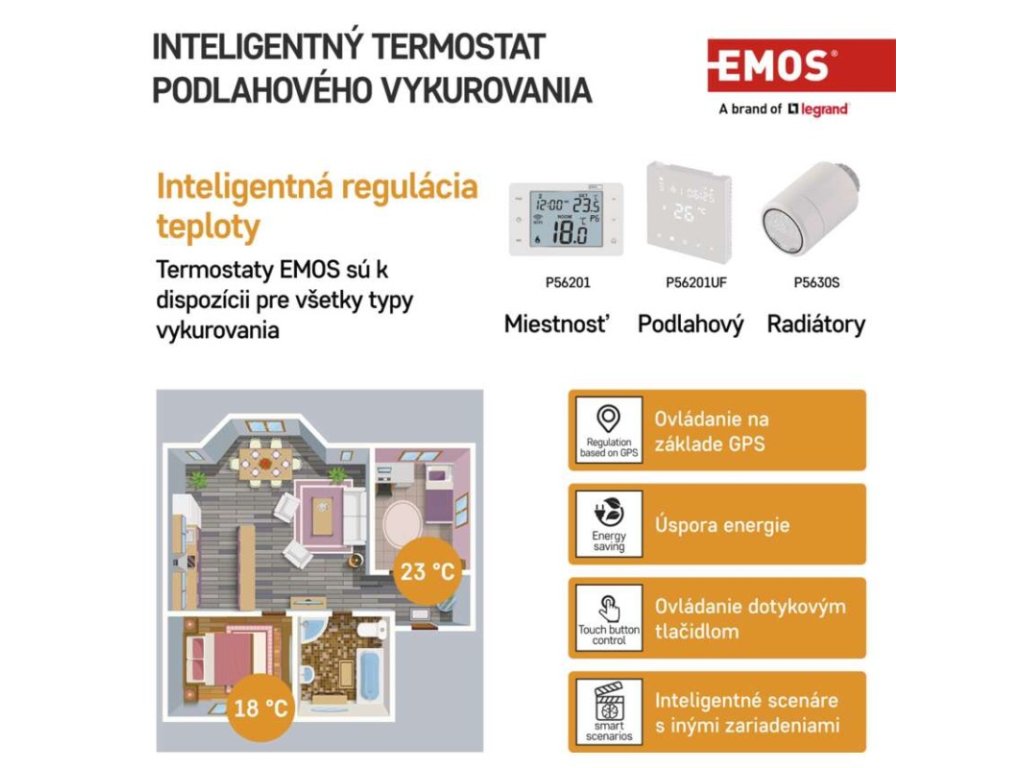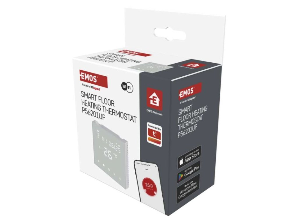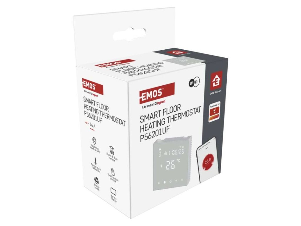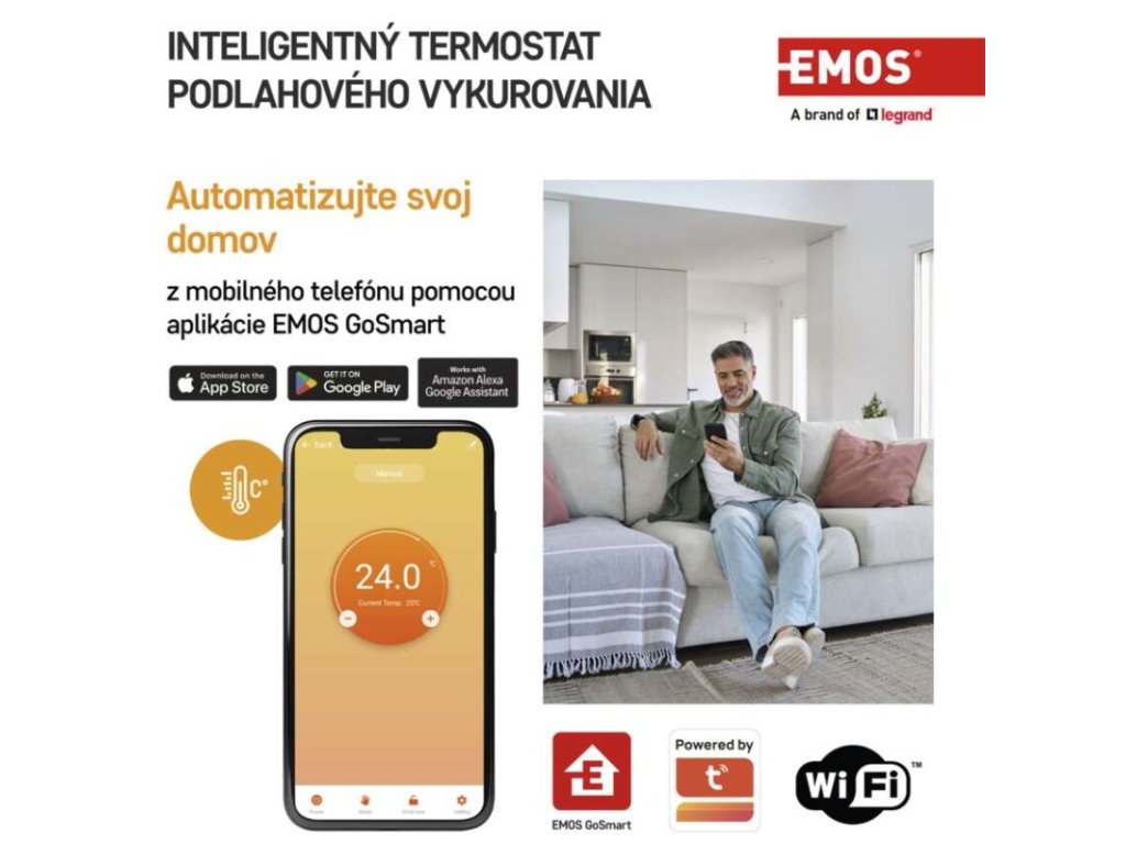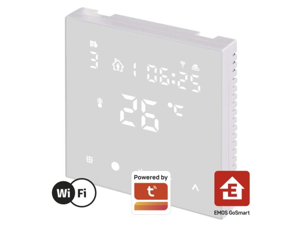 dĺžka kapilárneho čidla: neuvádza sa|dosah vo voľnom priestore: neuvádza sa|druh regulácie: vykurovací systém|farba: biela|funkcia ON/OFF: áno|funkcia prázdniny: áno|funkcia Set-back: nie|jazyky aplikácie: EN, CZ, SK, PL, DE, HU, SI, FR, + 60 ďalších jazykov|kalibrácia teploty: áno|kompatibilita: EMOS GoSmart, TUYA, LIDL, Smartlife, otvorený systém|meranie teploty: 0 °C až 95 °C, rozlišenie 0,5 °C|možnosť prepojenia s ďalšími detektormi: neuvádza sa|napájanie: 230 V AC|napájanie brány: neuvádza sa|napájanie prijímača: neuvádza sa|napájanie vysielača: neuvádza sa|nastavenie teploty: 1 °C až 70 °C, po 0,5 °C|nastaviteľný rozptyl teploty: vnútorné čidlo: 0,5 °C až 2,5 °C, rozlíšenie 0,5 °C; podlahové čidlo: 1 °C až 9 °C, rozlíšenie 1 °C|notifikácie do mobilnej aplikácie: áno|ochrana proti zamrznutiu: áno|ovládanie hlasovými asistentmi: áno (Amazon Alexa, Google Assistant)|počet programov: užívateľsky nastaviteľná teplota (6× za deň)|podlahový senzor: NTC 10 kΩ, 3 m|podporované OS: Android, iOS|podsvietený displej: áno|pracovná frekvencia: neuvádza sa|predajný obal: 1 ks, krabička|prenosová frekvencia: 2,4 GHz WIFI (IEEE802.11b/g/n)|protokol: Wi-Fi|rozmer: 86 × 86 × 43 mm|rozmer brány: neuvádza sa|rozmer prijímača: neuvádza sa|rozmer vysielača: neuvádza sa|spínaná záťaž: 16 A odporovo|spínanie: napäťové 230 V AC, 50 Hz|súčasť balenia: termostat, podlahové čidlo 3 m, Ø 8 mm|typ nastavenia teploty: 6 teplotných zmien denne|typ ovládania: programovateľný elektronický izbový termostat, možnosť ovládania cez mobil (iOS, Android)|typ termostatu: #Dodatočné parametre