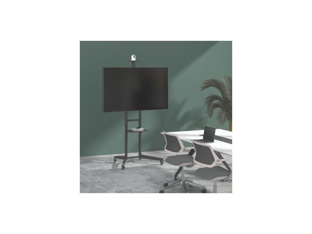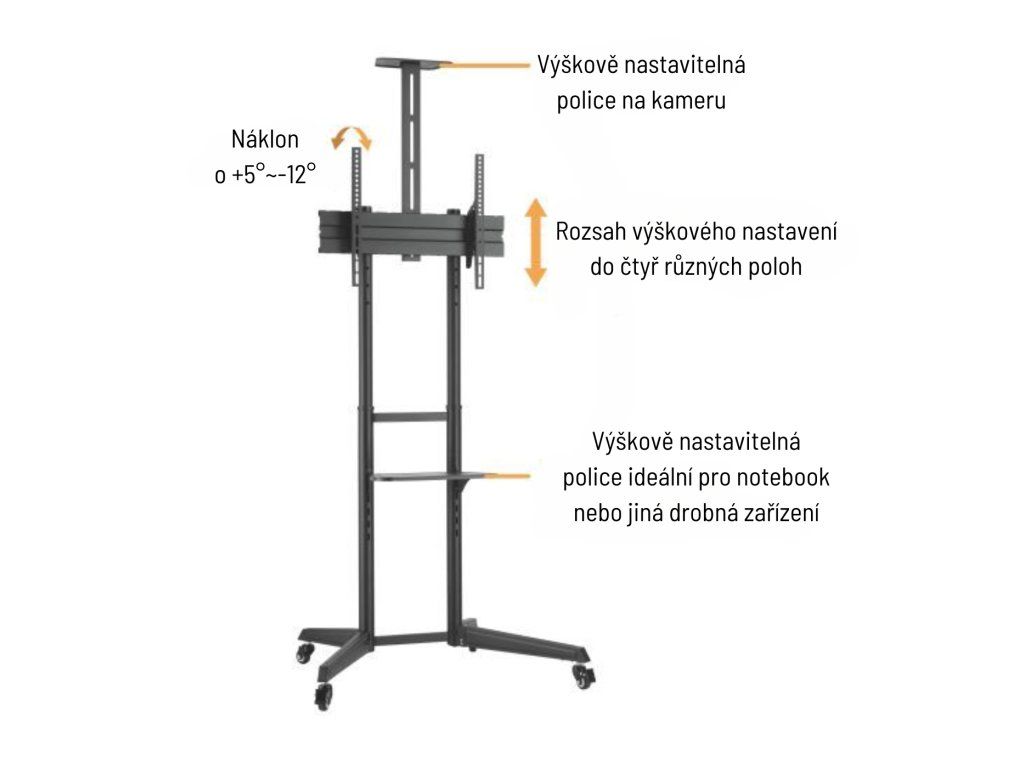 Všestranný pojízdný stojan Brateck T1040T je určen pro instalaci TV s plochou obrazovkou s úhlopříčkami od 37“ do 70“ a hmotností až 50 kg. Stojan poskytuje stabilní podporu a díky integrovaným kolečkům s možností aretace zároveň umožňuje snadné a bezpečné přemístění dle potřeby. Montážní deska pro upevnění TV je nastavitelná ve čtyřech různých výškových úrovních, jednoduchá změna náklonu TV v rozsahu +5°~-12° pak umožňuje nastavení optimálního pozorovacího úhlu. Stojan je navíc vybaven jednou výškově stavitelnou poličkou na kameru s nosností 5 kg a jednou výškově nastavitelnou poličkou na příslušenství s nosností 5 kg. Díky tomuto příslušenství je stojan vhodný pro pořádání telekonferencí, ale také pro využití při kancelářských a školních prezentacích, nebo při domácí zábavě. Hlavní vlastnosti: • Montáží deska pro upevnění TV je nastavitelná ve čtyřech výškových úrovních – 1285, 1340, 1395 nebo 1450 mm • Výškově nastavitelná police s nosností až 5 kg poskytuje dostatek úložného prostoru pro příslušenství • Výškově nastavitelná police s nosností až 5 kg na kameru • Jednoduchá změna náklonu TV v rozsahu +5°~-12° bez použití nástrojů • 4 kolečka umožňují snadné a bezpečné přemístění stojanu dle potřeby, 2 kolečka s možností aretace • Vnitřní vedení kabelů rámem stojanu pro jejich snadnou organizaci a uspořádání • Podporované rozteče VESA: 100x100,200x100,200x200,300x200,400x200,300x300,400x300,400x400,600x400 • Jednoduchá a rychlá montáž Parametry: • Určeno pro zařízení: TV • Způsob montáže: samostatně stojící • Počet TV: 1 • Rozsah výškového nastavení: 1285, 1340, 1395 nebo 1450 mm • Maximální náklon (nahoru, dolů): +5°~-12° • Maximální vychýlení (vpravo, vlevo): 0° • Maximální otáčení obrazovky: 0° • Maximální hmotnost TV: 50 kg • Minimální rozměr TV: 37'' • Maximální rozměr TV: 70'' • Barva: černá mat • Rozměry (Š x V x H): 871mm x 678mm x 1966mm • Hmotnost: 12.2 kgDodatočné parametre