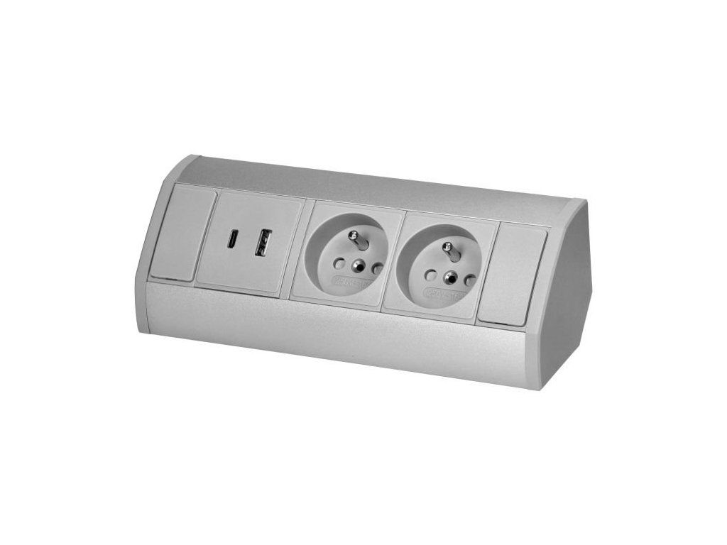 Povrchová zásuvka ORNO OR-GM-9039/G, rohové púzdro, 2x 230V, 2x USB (A+C type; 2.4A), farba šedá-strieborná