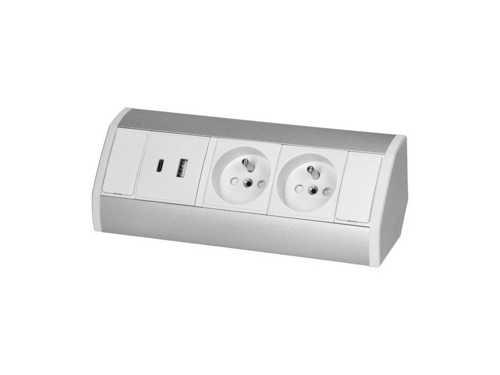Povrchová zásuvka ORNO OR-GM-9039/WG, rohové púzdro, 2x 230V, 2x USB (A+C type; 2.4A), farba biela-striebornáNábytková zásuvka je praktickým riešením, ktoré dobre funguje v interiéroch, kde je potrebný ľahký prístup k elektrine. Prezentovaná zásuvka je prisadená a vďaka svojmu dizajnu je možné ju esteticky integrovať napr. Má krytie IP20 a môže byť inštalovaný na suchých miestach, ktoré nie sú vystavené vlhkosti.