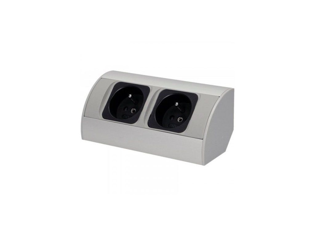 Povrchová zásuvka, rohové púzdro, 2x zásuvka, farba striebornáModerný blok v striebornej farbe, dvoma zásuvkami so stabilnou a pevnou konštrukciou. Ideálne pre montáž v skriniach, vitrínach alebo pracovných doskách. Zásuvku je možné pripevniť aj na horľavý povrch a musí byť pripojená k domácemu el. systému s uzemnením.