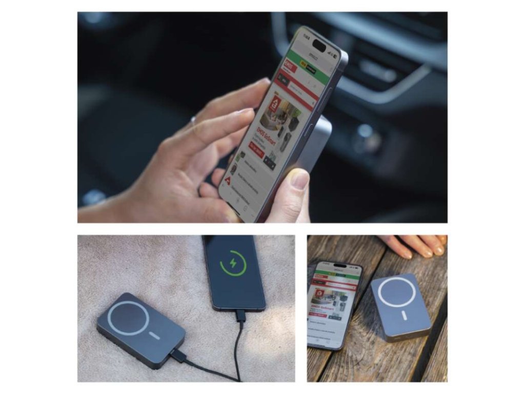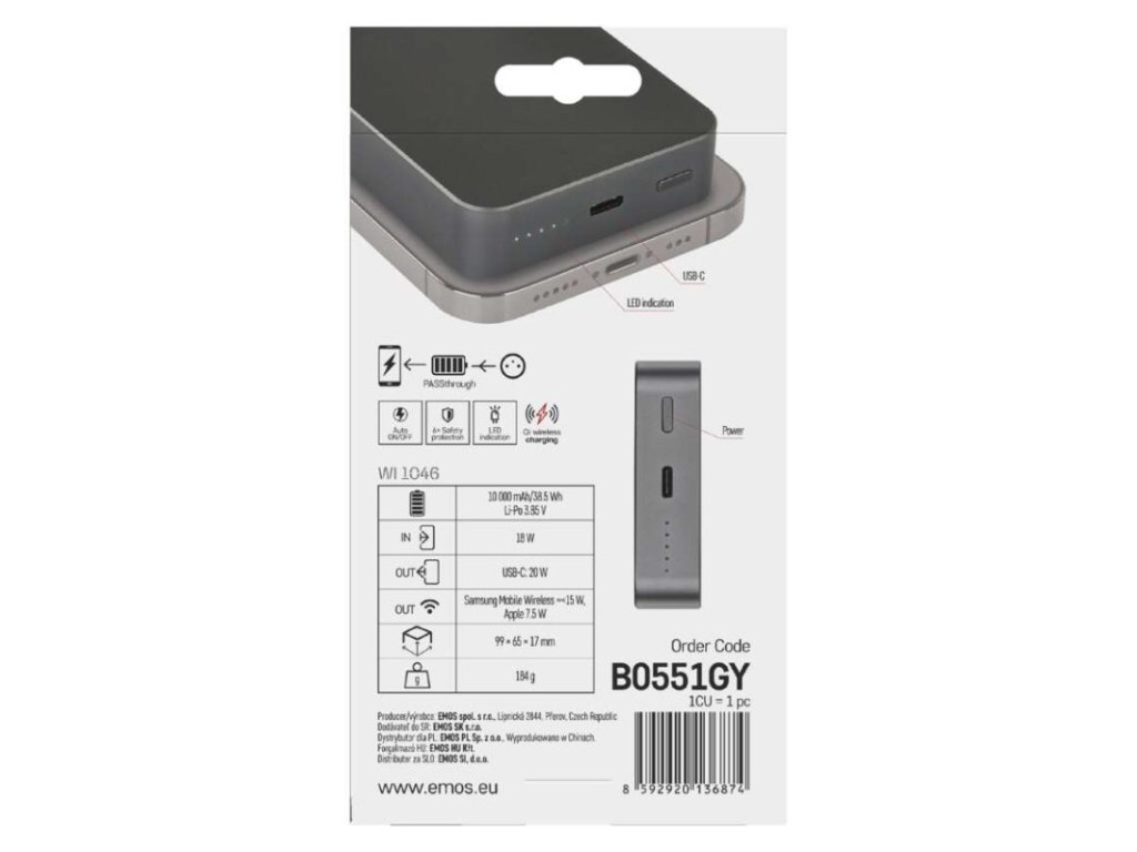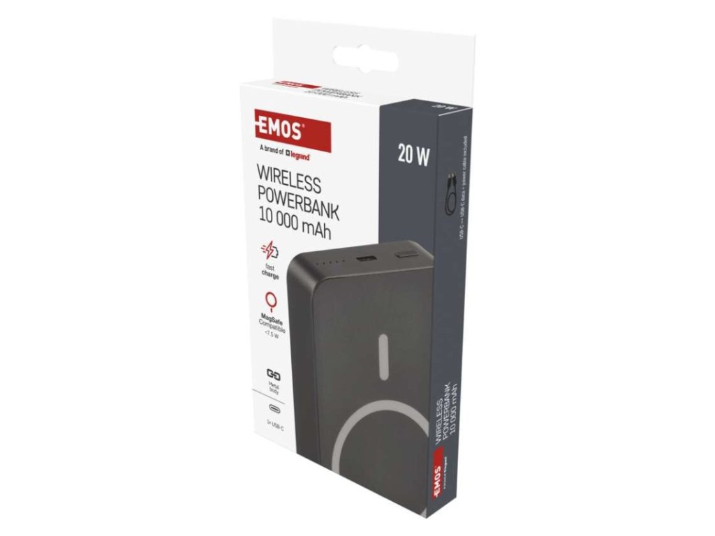 Power bank EMOS WI 1046, 10 000 mAh, 20 W+Wireless, šedá