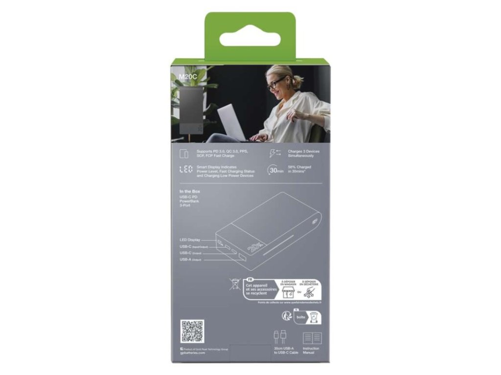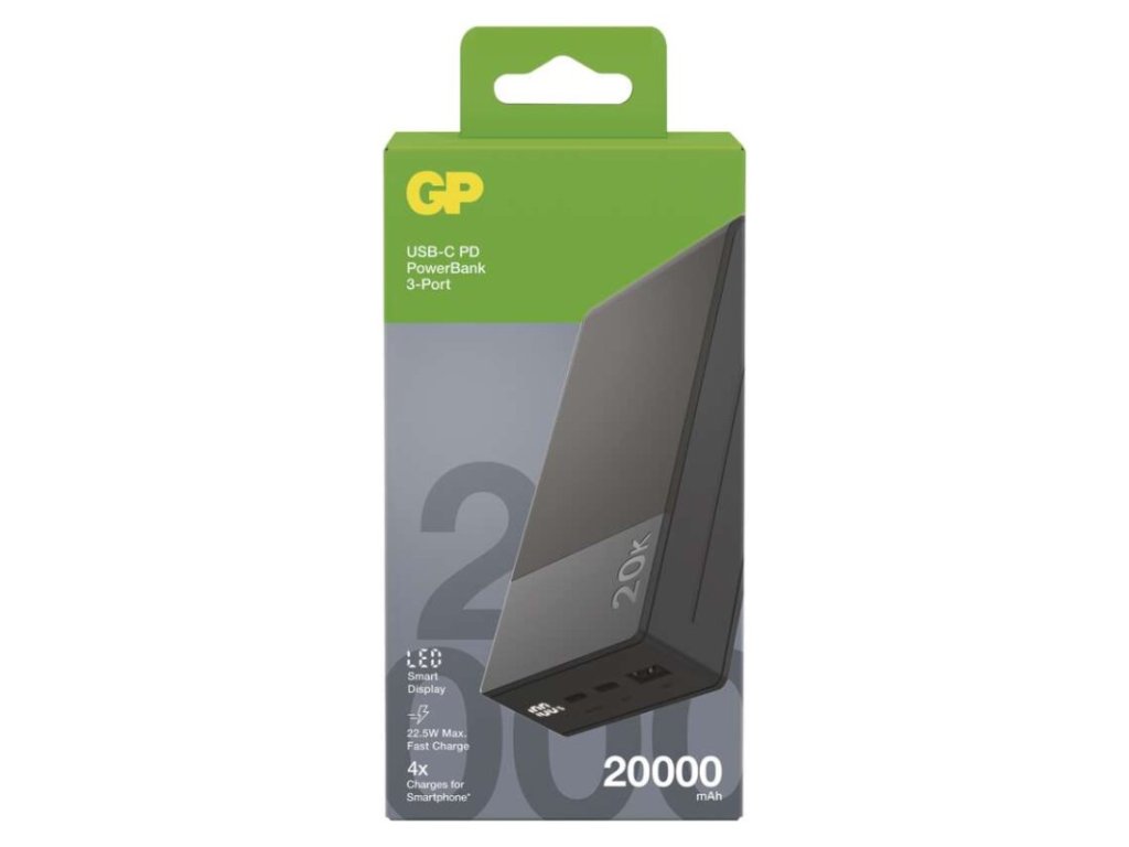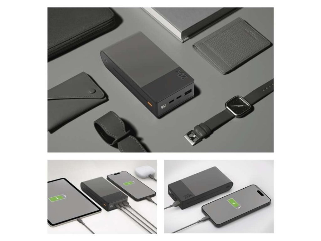 auto ON/OFF: neuvádza sa|doba nabíjania: 6,5 hodín|farba: sivá|hmotnosť: 430 g|kapacita akumulátora: 20 000 mAh/74 Wh|LED indikátor nabíjania: áno|LED indikátor stavu batérie: áno|materiál: ABS plast|max. vstupný výkon: 18 W|max. výstupný výkon: 22,5 W|ochrana proti podbitiu: áno|ochrana proti prebitiu: áno|ochrana proti preťaženiu: áno|ochrana proti skratu: áno|passthrough: áno|predajný obal: 1 ks, papierová krabička|prevádzková teplota: 0 °C až +45 °C|pribalený kábel: USB-A/USB-C|rozmer: 146 × 68 × 29 mm|rýchle nabíjanie: PD 22,5 W|typ akumulátora: Li-Po 3,7 V|typ vstupného rozhrania: 1× USB-C|typ výstupného rozhrania: 2× USB-C, 1× USB-A|záručná doba: 2 rokyDodatočné parametre