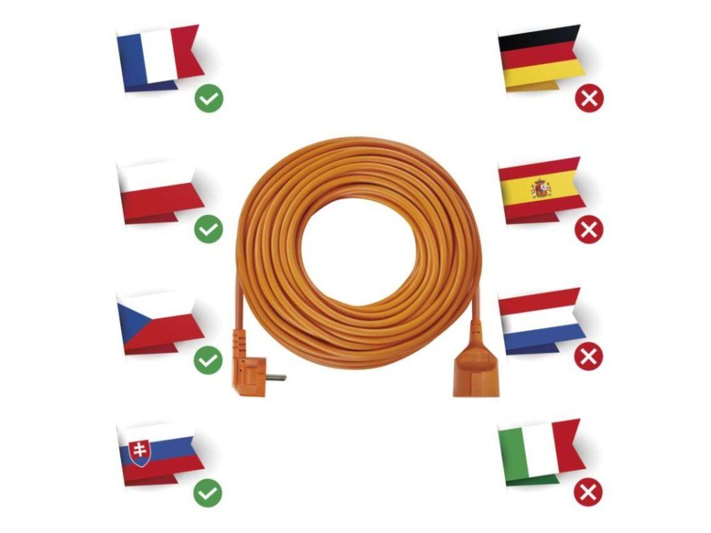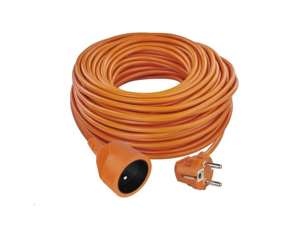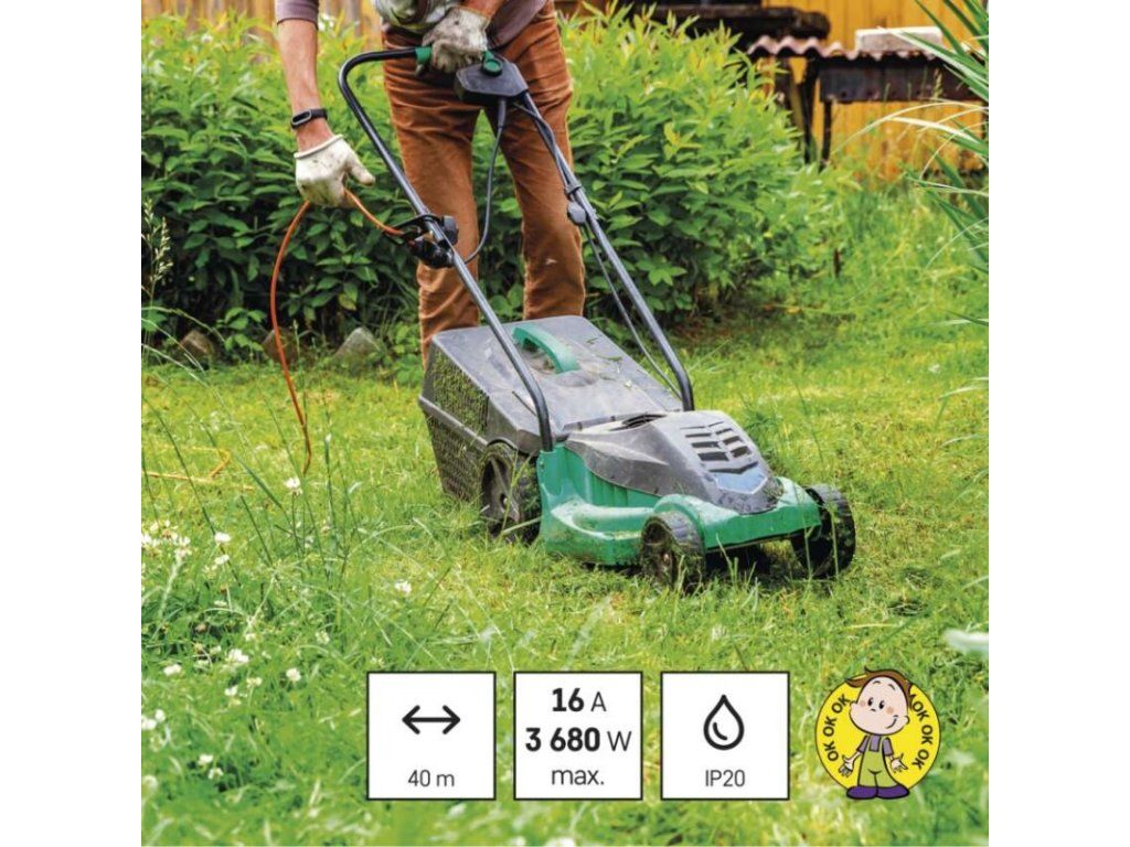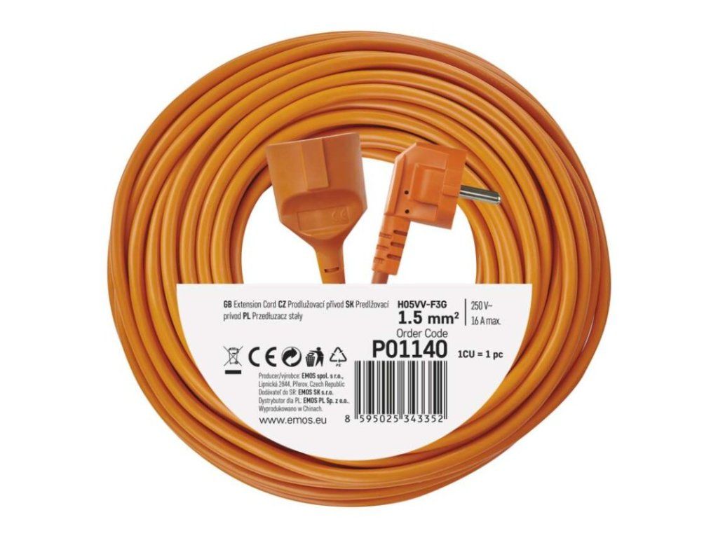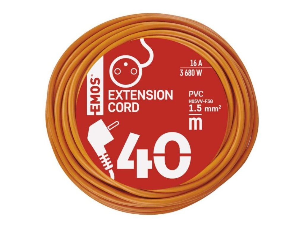 Oranžový predlžovací kábel, 1 zásuvka s dĺžkou 40 m a prierezom vodiča 1,5 mm2. Vhodný pre maximálne zaťaženie 16 A max. Predlžovací kábel 40 m pre 250 V AC sa používa na predĺženie napájania tam, kam pevná zásuvka nedosiahne. Parametre produktu - dĺžka: 40 m - počet zásuviek: 1× 2P + PE - vypínač: nie - napätie/prúd: 250 V~/16 A max. - farba: oranžová - vodič: H05VV-F3G 1,5 mm2 - detské zásteny: áno - typ izolácie: PVC - materiál zásuvky a zástrčky: plast - Výstup USB: nie - max. zaťaženie: 3 680 W - predajné balenie: 1 kus, PVC vreckoDodatočné parametre