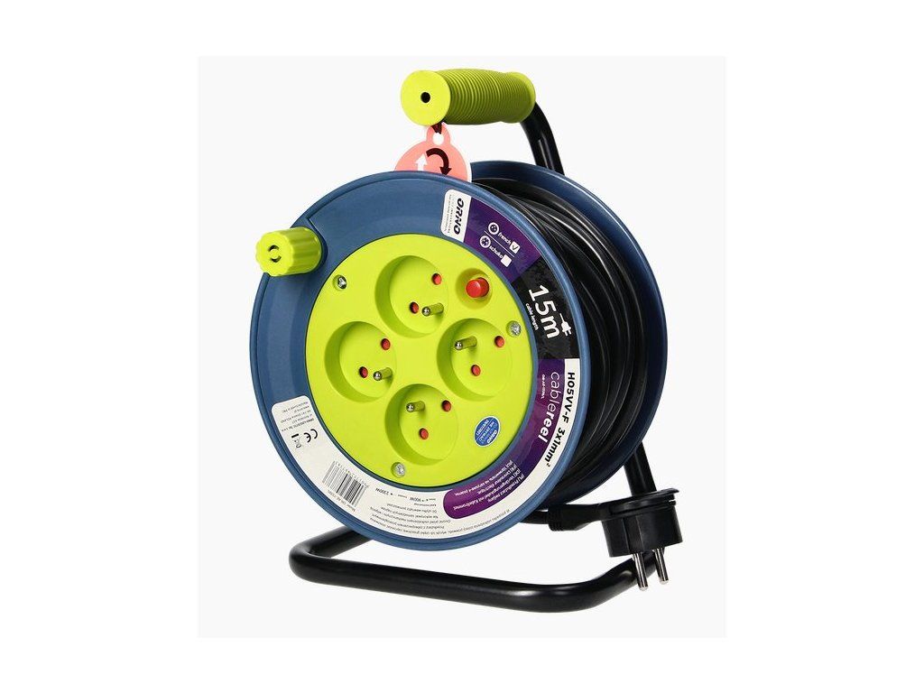 Bubnová predlžovacia šnúra na navijaku s kovovým stojanom a ochranou proti preťaženiu v podobe tepelného spínača. Má štyri sieťové zásuvky s uzemnením a membránami prúdového obvodu, pohodlnú rukoväť na prenášanie a klip na upevnenie zástrčky. Malé puzdro umožňuje pohodlné použitie a skladovanie doma, na pozemku, v kancelárii a pod. Vybavené kľukou na navíjanie kábla a blokovaním náhodného odvinutia. Dostupné farby: šedá, limetková, tyrkysová.