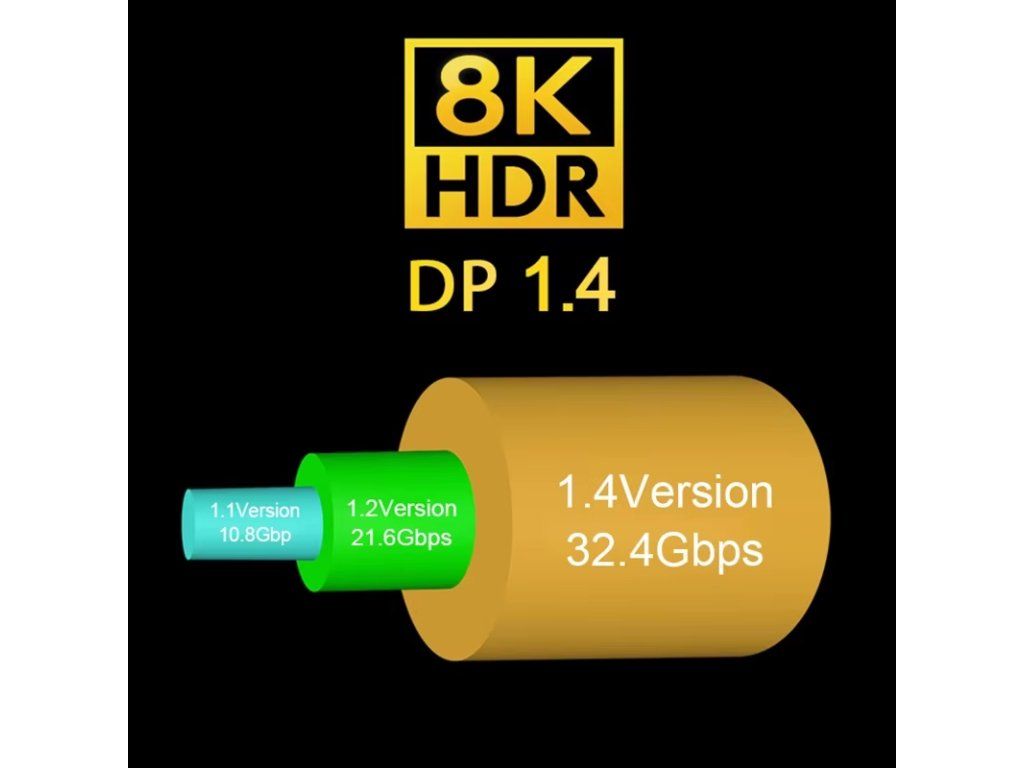 PremiumCord 8K optický DisplayPort 1.4 přípojný kabel M/M, zlacené konektory 30 m Optický AOC kabel se vyznačuje vynikajícím přenosem signálu na velké vzdálenosti beze ztrát, je odolný proti elektromagnetickému rušení a dává nejlepší možný obraz ve srovnání s metalickými kabely. Optický DisplayPort kabel slouží pro spojení dvou audio/video zařízení přes moderní DisplayPort rozhraní, jako je např. HD-DVD/BluRay přehrávač a LCD/Plazma televizor. kabel přenáší digitální zvuk i obraz . Díky technologii AOC a optickému vláknu se kabely vyrábějí v délkách 10m, 15m, 20m, 25m, 30m a 50m. Tenká a lehká konstrukce kabelu jej předurčuje pro všechny druhy instalací. Technické parametry Maximální rozlišení: - 8K (7680x4320) při 60Hz a 24 bitová barevná hloubka - 5K (5120x2880) při 60Hz a 30 bitová barevná hloubka - 4K (3840×2160) při 144Hz a 24 bitová barevná hloubka - FULL HD 1080p (1920x1080) při 144Hz Podpora DisplayPort 1.4 standard - kompletní napájení ze sběrnice DisplayPort - nepotřebuje externí napájení - podporuje HDCP2.2 , 3D a EDID Pozlacené konektory: DisplayPort male <=> DisplayPort male - pozlacené kontaktní plochy zajišťují optimální přenos signálu a zabraňují korozi - kulatý tenký optický kabel (vnitřní struktura: optický kabel + metalické vodiče) je vhodný pro všechny instalace Optické vlákno: OM3 Multimode Fibre Optic - optický kabel převádí elektrické datové signály na optické a zpět na elektrické signály, v konektorech je integrován speciální chip, proto je kabel jednosměrný a konektory jsou označeny SOUCE a DISPLAY - díky skleněnému vláknu je kabel vysoce flexibilní a nabízí velmi malý poloměr ohybu 20 mm * Maximální datový přenos: 32,4 Gb/s * Tloušťka optického kabelu: 4,6 mm * Barva kabelu: černá * Pracovní teplota: 0°C až 50°C * Balení v papírové krabičce s EAN kódem a popisem + manuál * Délka kabelu: 30 m Upozornění Kabel obsahuje aktivní elektroniku, která funguje pouze v jednom směru signálu. Kabel se musí vždy zapojit při vypnutých zařízeních, a to pouze ve směru vyznačeném na kabelu. Konektor označený ''Source'' se vždy zapojuje do vysílacího zařízení (DVD, Blueray). Konektor označený ''Display'' se vždy zapojuje do zobrazovacího zařízení (LCD,televize, projektor).Dodatočné parametre
