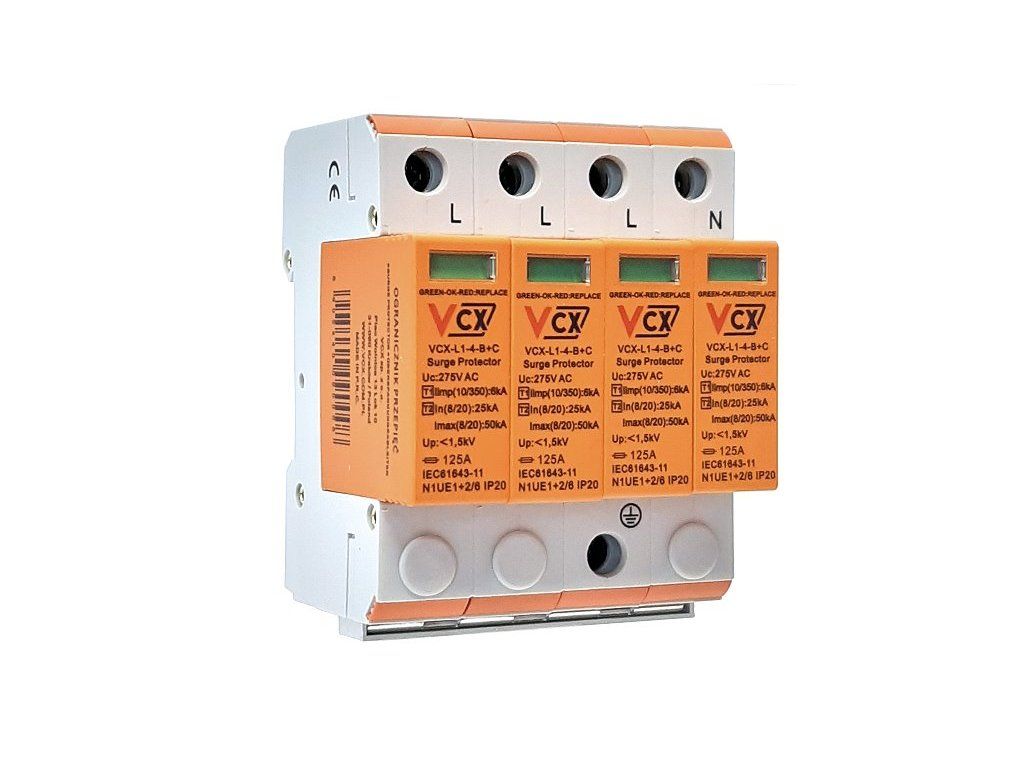 Současně poskytují dvoustupňovou úroveň ochrany. Použití modulárních přepěťových ochran VCX-L1-B+C 6kA třídy T1T2 nevyžaduje použití oddělovacích tlumivek. Poskytují účinnou ochranu počítačů, spotřební elektroniky/spotřebičů atd. Jsou vybaveny vizuálním indikátorem provozu (zelená - ochrana, červená - bez ochrany).