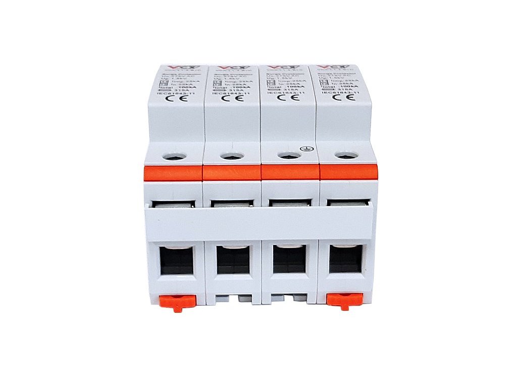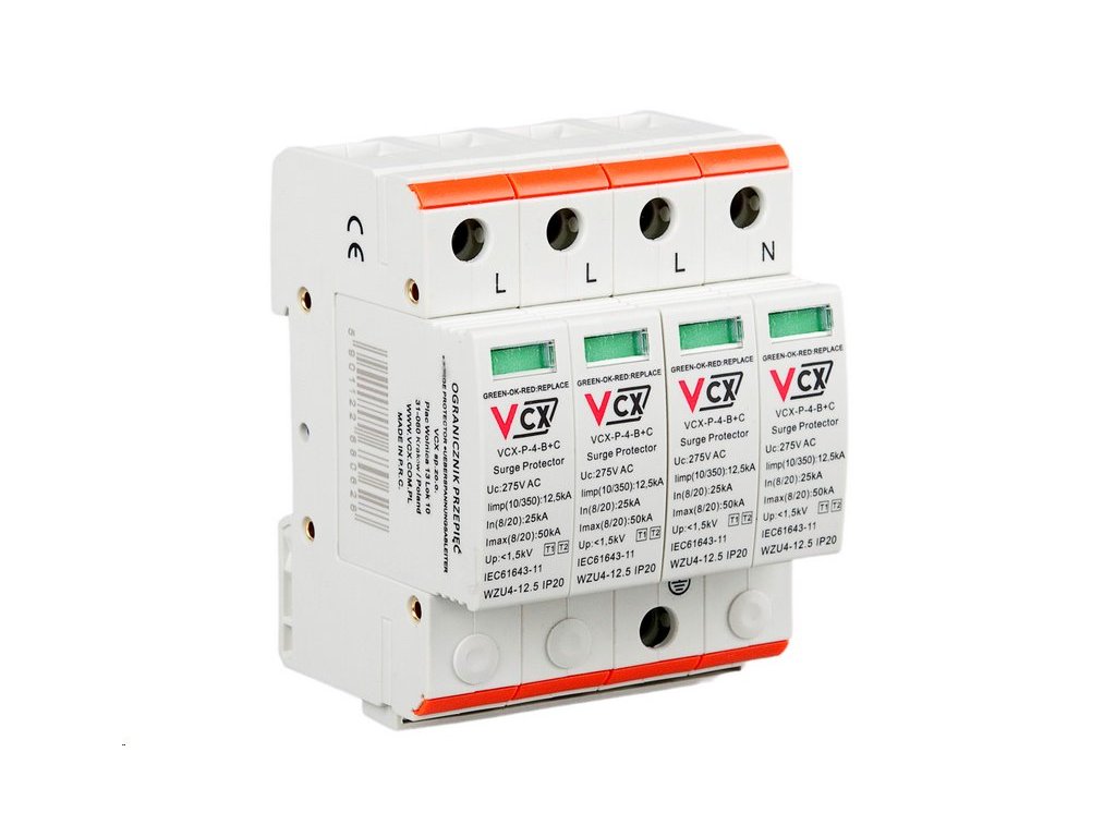 Špičková modulární přepěťová ochrana VCX-P-4-B+C 12.5 kA třídy T1+T2 určená k ochraně napájecích instalací NN proti indukovaným a spínacím přepětím.+