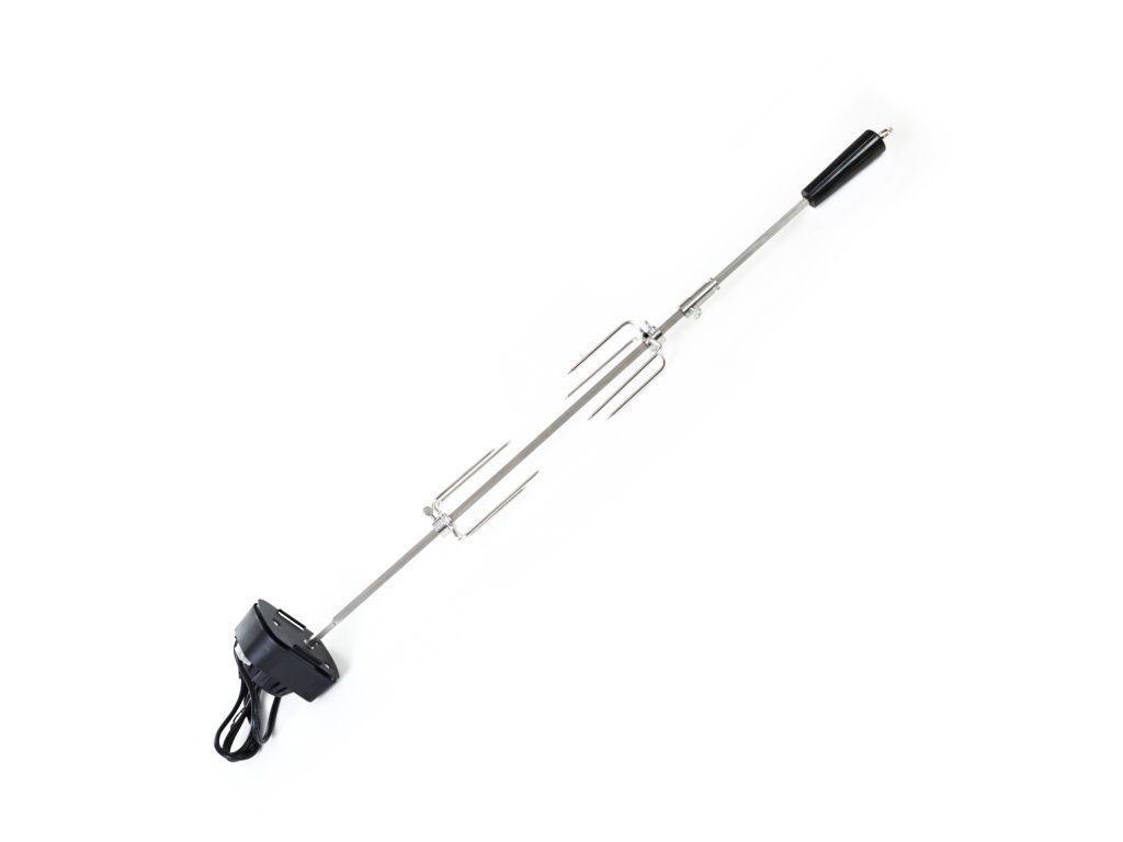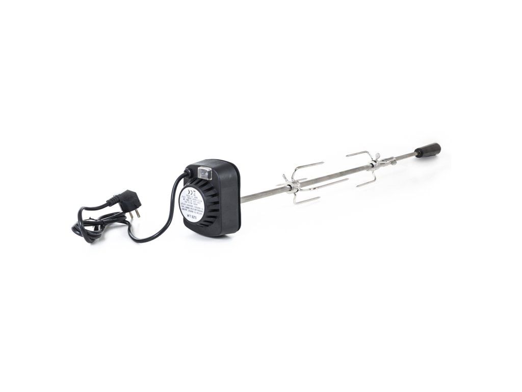 Z jednej strany je ihla opatrená odnímateľným plastovým držadlom, na ktorom je praktické očko pre uchytenie. Z druhej strany sa nachádza motorček v plastovom kryte, na ktorom je umiestnené tlačidlo na zapínanie / vypínanie. Motorček s napätím 230 V jednoducho zapojíte do elektriny pomocou kábla s dĺžkou cca 125 cm. Motorček s ihlou otáča rýchlosťou asi 2 otáčky za minútu, aby sa pripravovaný pokrm nepripekal, ale piekol sa rovnomerne.
