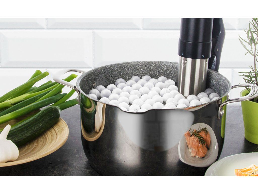 Ponorný sous-vide varič totiž neumožňuje použitie pokrievky, ktorá by zabránila tepelným stratám a odparovaniu vody. Preto odporúčame použitie izolačných guličiek G21 – pokryjú hladinu vody v nádobe a zamedzia úniku tepla.