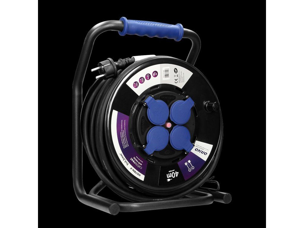 Profesionálny predlžovací kábel 40m ORNO, IP44, 4 zásuvky 2P + ZPredlžovací kábel na valcovanom bubne s inovatívnym systémom proti skrúteniu (pevné zásuvky), jedinečným kovovým stojanom CUBE a ochranou proti preťaženiu vo forme tepelného spínača. H07RN-F gumový, olejovzdorný kábel, dlhý 40 m. Má 4 uzemnené zásuvky s uzemnením, membrány prúdového obvodu a tesniace kryty, ktoré chránia pred nečistotami a vlhkosťou, pohodlnú gumovú rukoväť na prenášanie, otočnú rukoväť navíjania kábla, zámok otáčania bubna a zaplavenú zástrčku IP44. Vhodný do drsných podmienok použitia aj vonku.