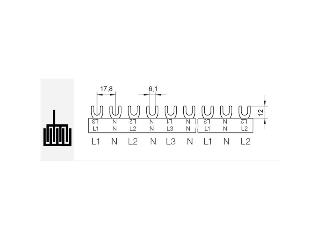 Prop. lišta G-L1+N-L2+N-L3+N-1000/16 P, vidlička, 4pól., 80A, rozteč 17,8mm, 16mm2, 1m, přip. míst = 54, pro šroub M5-M6, koncovka EK-C-4/16. Propojovací fázové lišty umožňují propojení modulových přístrojů (např. jističů, chráničů, modulových vypínačů apod.) jednoduchým a profesionálním způsobem. Standardní délky lišt jsou 210 mm (propojení 12ti modulů) nebo 1 metr. Tyto standardní rozměry lze libovolně krátit (konce lišt doporučujeme osadit plastovými koncovkami). Ve srovnání s klasickou instalací pomocí kabelových mostů nabízí propojovací lišty následující výhody:• spolehlivé přiřazení fází