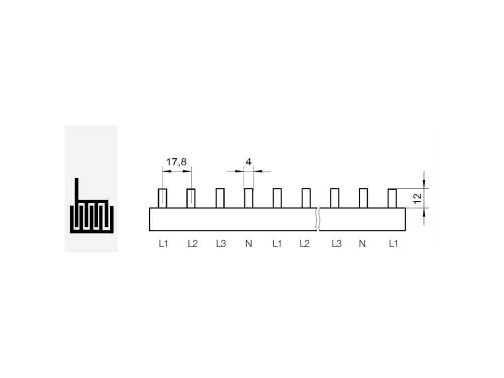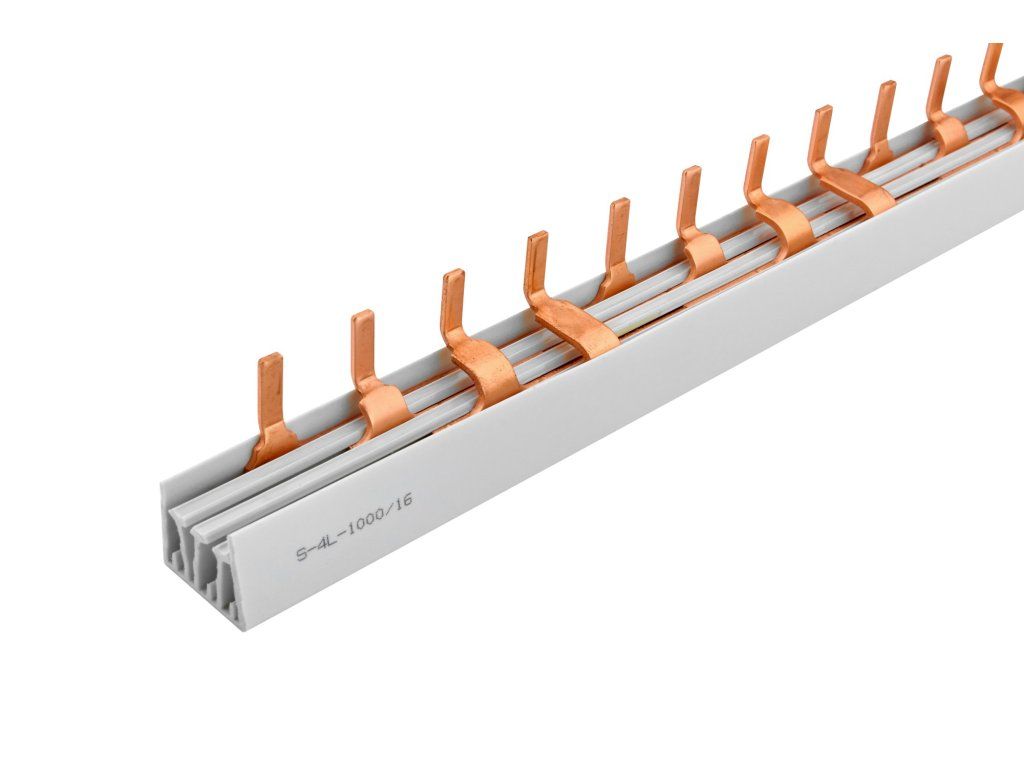 Prop. lišta S-4L-1000/16, kolík (jazýček), 4pól., 80A, rozteč 17,8mm, 16mm2, 1m, přip. míst = 56, rozměr kolíku 4x11,5mm, koncovka EK-C-4/16. Propojovací fázové lišty umožňují propojení modulových přístrojů (např. jističů, chráničů, modulových vypínačů apod.) jednoduchým a profesionálním způsobem. Standardní délky lišt jsou 210 mm (propojení 12ti modulů) nebo 1 metr. Tyto standardní rozměry lze libovolně krátit (konce lišt doporučujeme osadit plastovými koncovkami). Ve srovnání s klasickou instalací pomocí kabelových mostů nabízí propojovací lišty následující výhody:• spolehlivé přiřazení fází