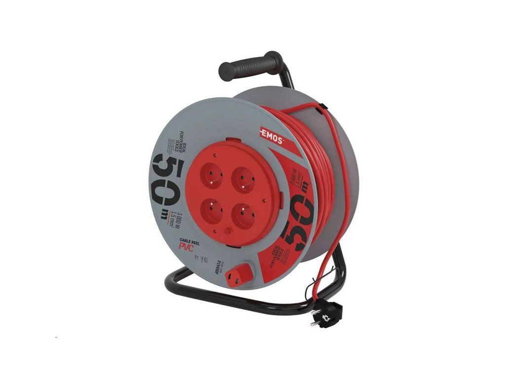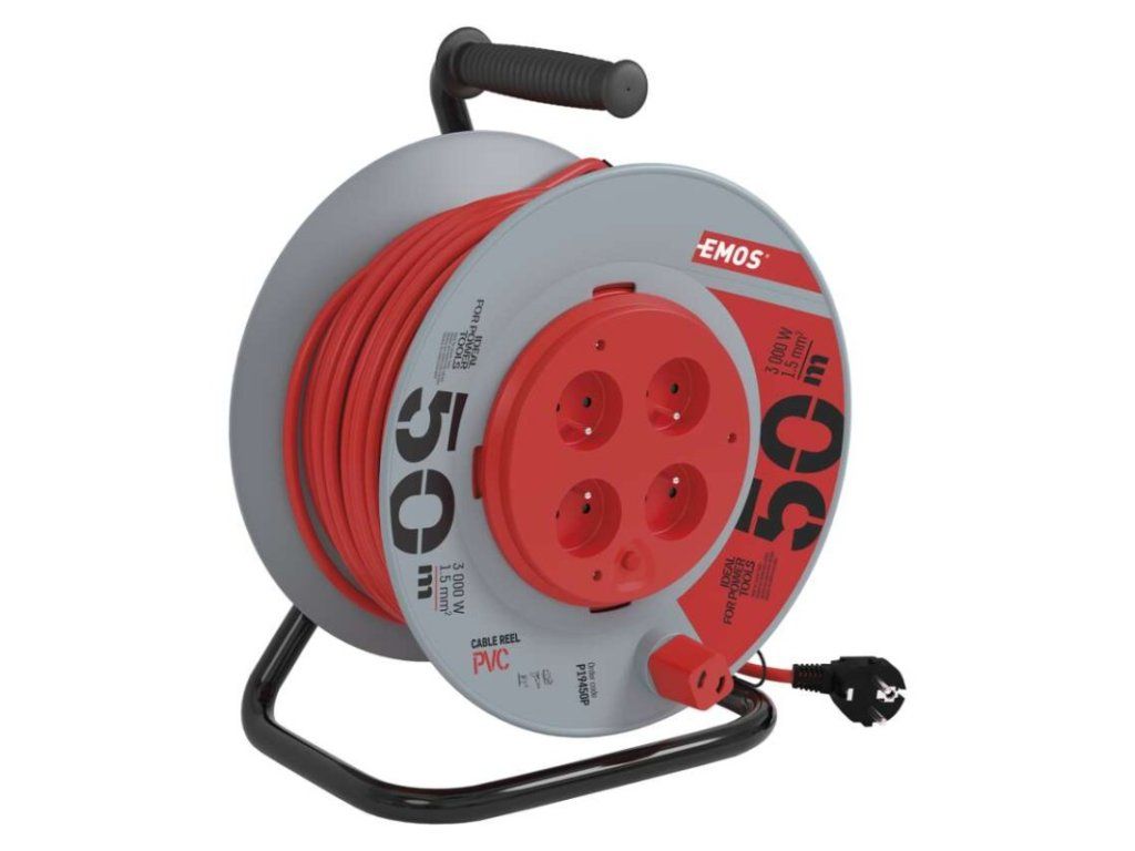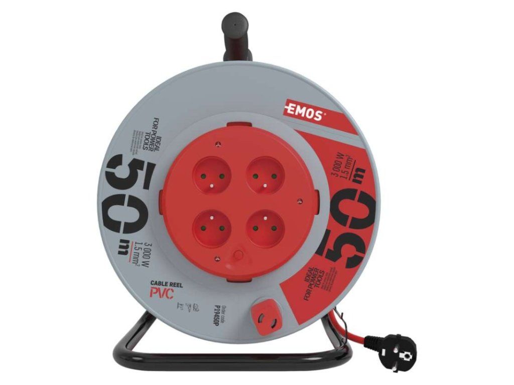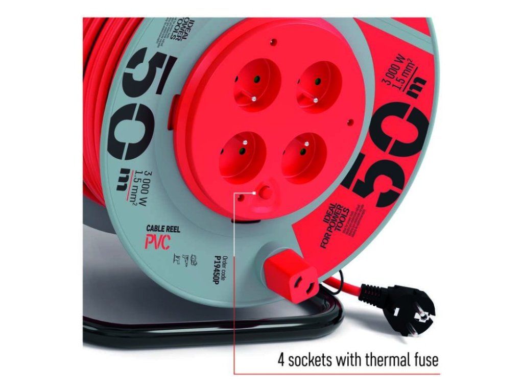 Predlžovací kábel na bubne s pevným stredom. 4 zásuvky 230 VAC. Dĺžka predlžovacieho kábla 50 m. Vodič z PVC - H05VV-F3G 1,5 mm2