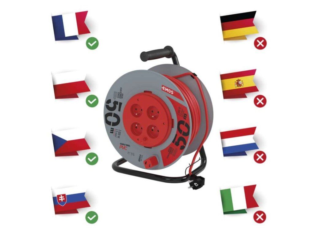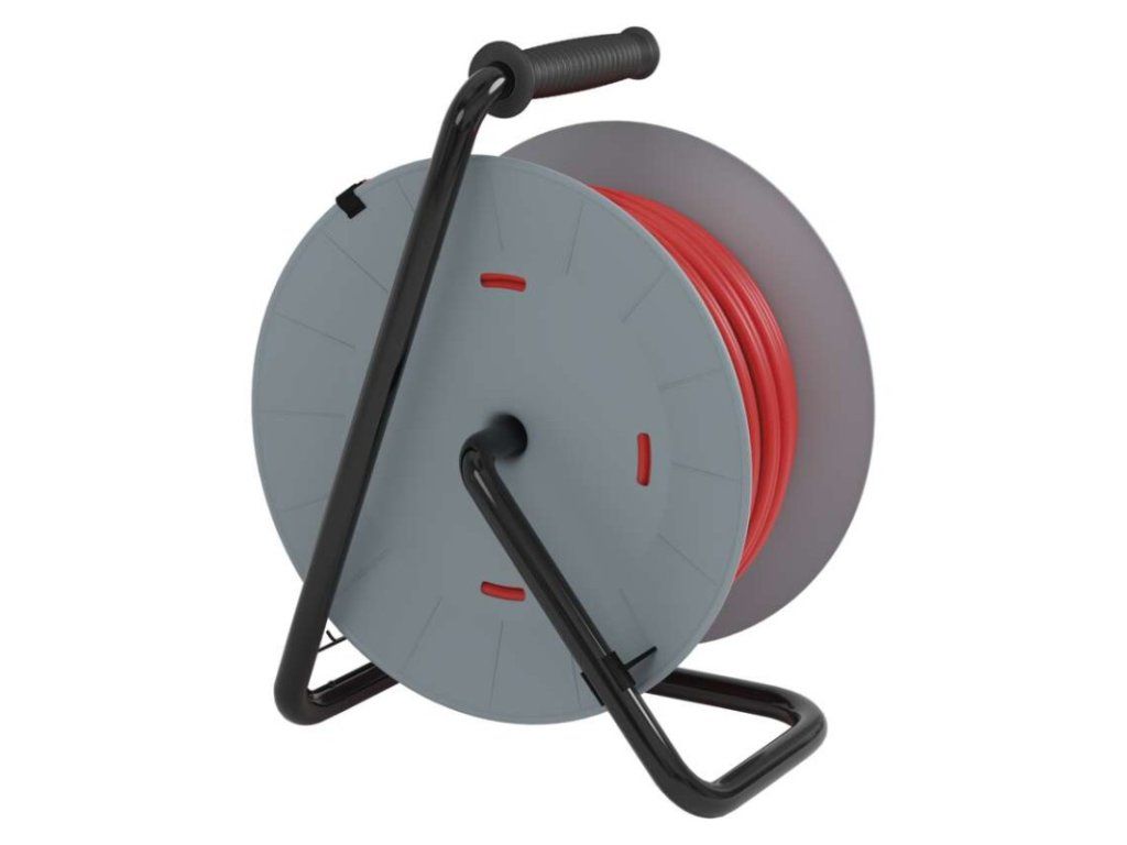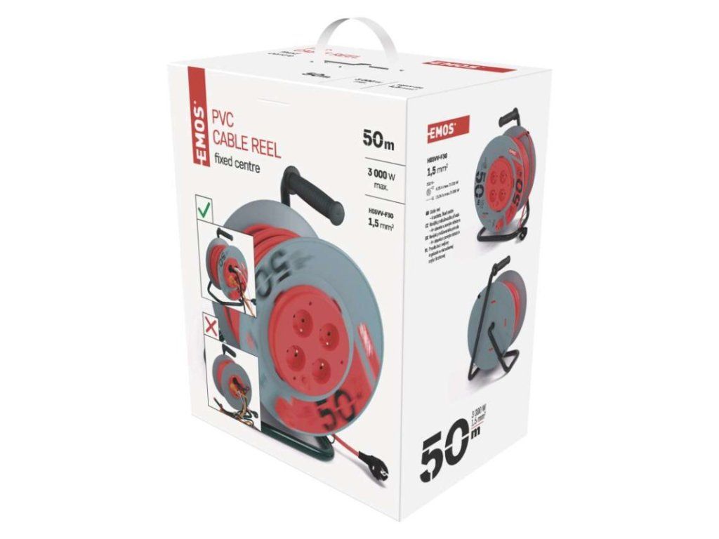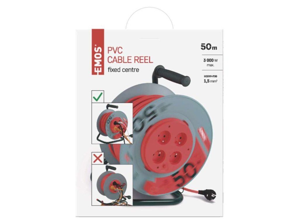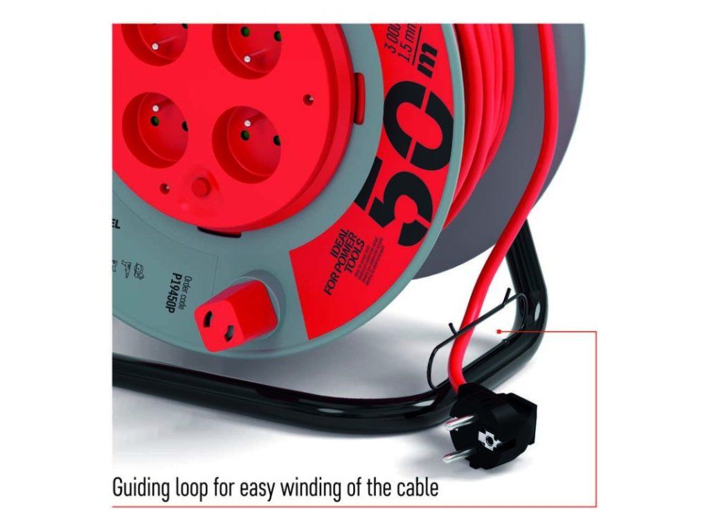 Predlžovací kábel na bubne s pevným stredom. 4 zásuvky 230 VAC. Dĺžka predlžovacieho kábla 50 m. Vodič z PVC - H05VV-F3G 1,5 mm2