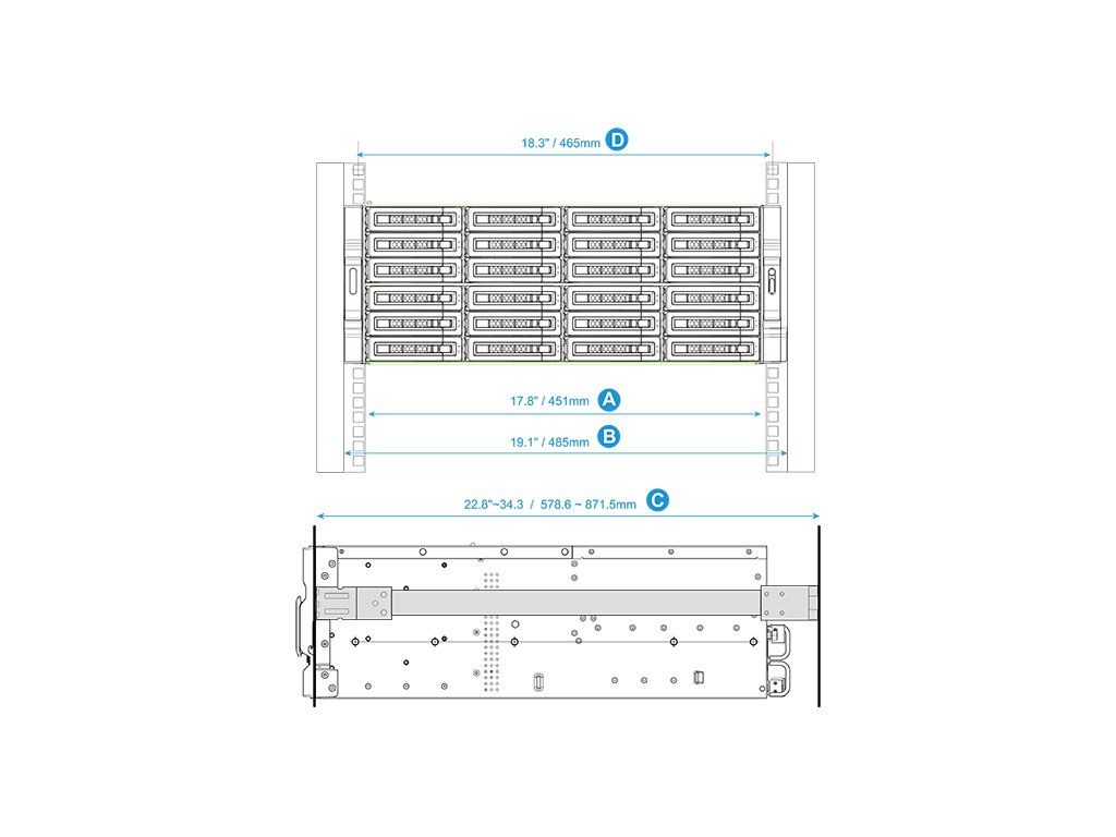 Velikost racku A. Šířka montážního sloupku: >= 17,8'' (451 mm) B. Šířka panelu: >= 19,1'' (485 mm) C. Hloubka montážního sloupku: 22.8'' ~ 34.3'' / 578.6 ~ 871.5 mm D. Vzdálenost mezi dvěma rackovými sloupky (měření čtvercových otvorů racku střed-střed) je 18,3''(465 mm)Rackové sady jsou kompatibilní pouze se serverovými racky se čtvercovými otvory 9,5 x 9,5 mm. Vhodné pro zařízení: TS-EC2480U-RP, TVS-EC2480U-SAS-RP, TS-2477XU-RP, TVS-2472XU-RP, TS-2483XU-RP