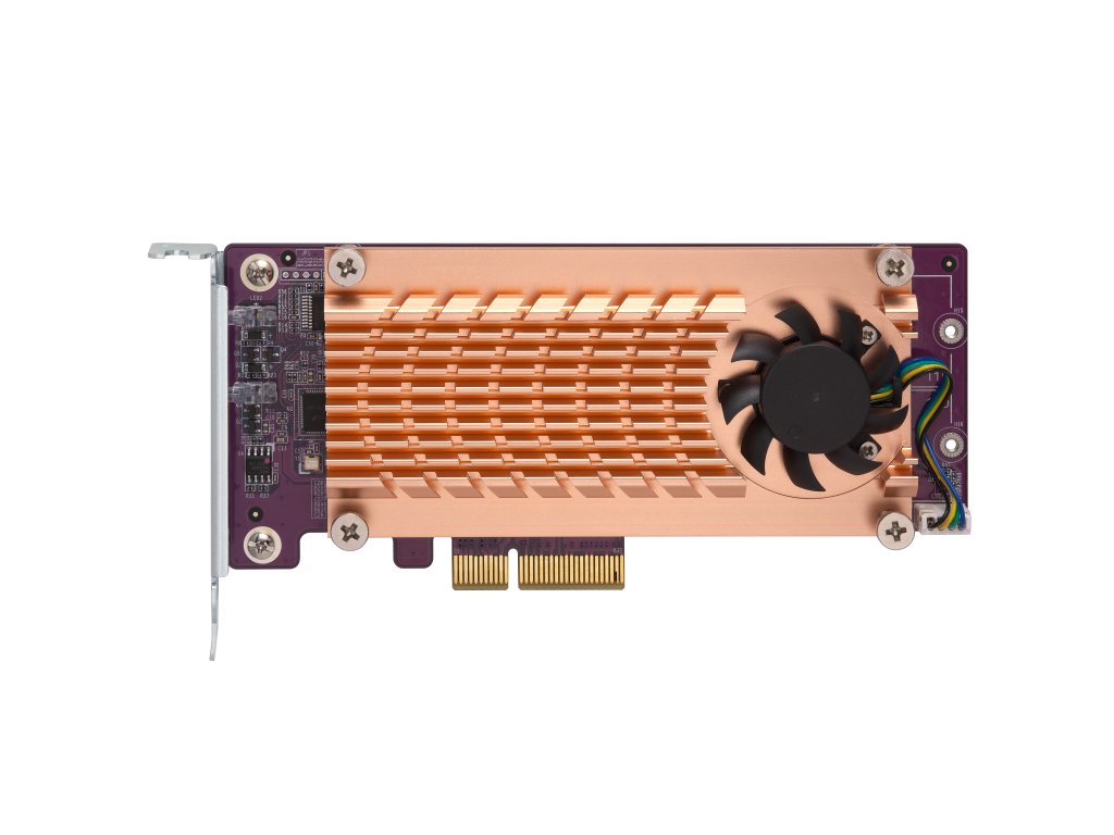 Dvojitá rozšiřující karta M.2 22110/2280 PCIe NVMe SSD. Konektor: 2 x sloty M.2 22110 nebo 2280 PCIe (Gen2 x 4) NVMe SSD PCIe a kanály: PCIe Gen2 x 4 Držák: Nízkoprofilový (výchozí). Součástí dodávky je také nízkoprofilový plochý držák a držák s úplnou výškou. Rozměry: 147.15 x 68.9 x 20.6 mm Vhodné pro modely: TS-531P, TS-531X, TS-831X, TS-1635, TS-x31XU, TS-x53B, TS-563, TVS-x63, TS-x63U, x73, TS-x73U,TS-x70, TS-x70U, TVS-x71, TVS-x71U, TS-x77, TS-1677X, TVS-x82(T)Dodatočné parametre