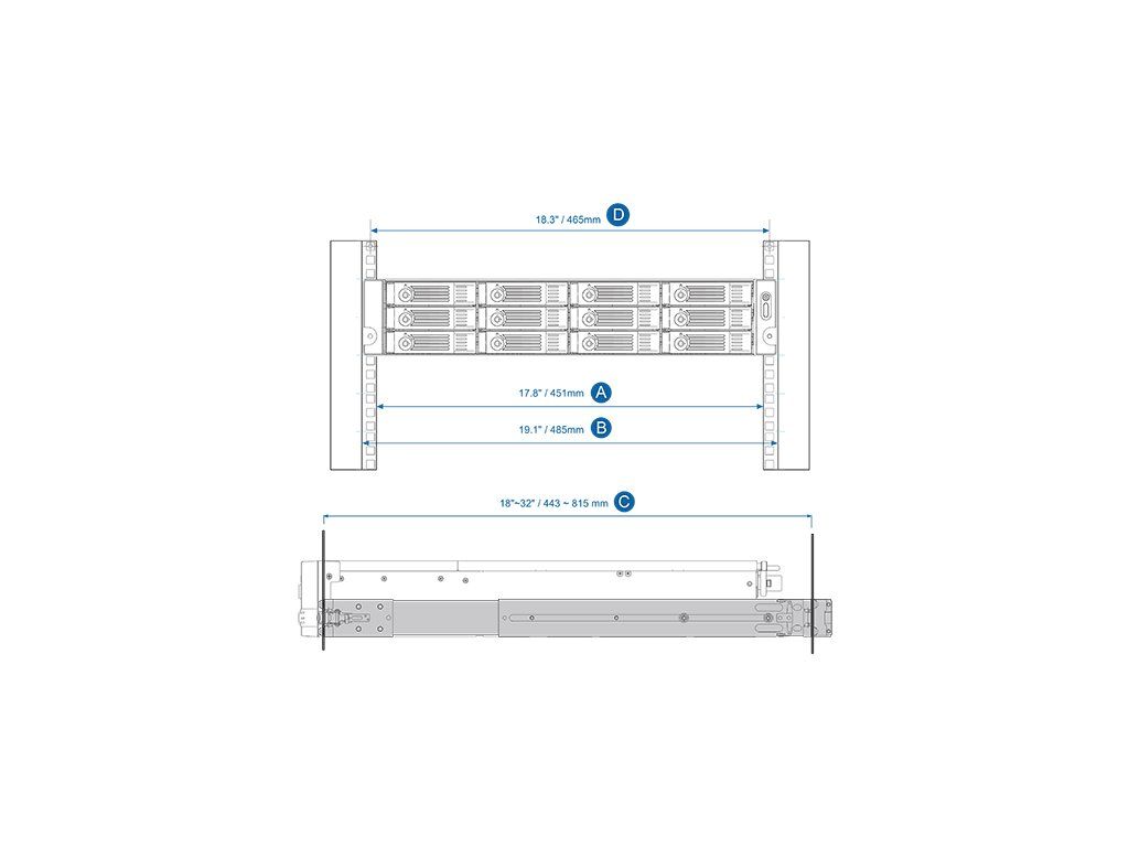 Velikost racku Šířka montážního sloupku: >= 17,8'' (451 mm) B. Šířka panelu: >= 19,1'' (485 mm) C. Hloubka montážního sloupku: 18'' ~ 32'' / 443 ~ 815 mm D. Vzdálenost mezi dvěma rackovými sloupky (měření čtvercových otvorů racku střed-střed) je 18,3''(465 mm)Kompatibilní se serverovými stojany se čtvercovými otvory 9,5 mm x 9,5 mm nebo s kulatými otvory o průměru 7,1 mm. Vhodné pro modely:QGD-1600P, TL-R1200C-RP, TL-R1200S-RP, TL-R1220Sep-RP, TL-R1620Sep-RP, TL-R400S, TR-004U, TS-1231XU(-RP), TS-1232PXU-RP, TS-1232XU(-RP), TS-1232BU(-RP), TS-1253DU-RP, TS-1253U(-RP), TS-1263U(-RP), TS-1263XU(-RP), TS-1273AU-RP, TS-1273U(-RP), TS-1277XU-RP, TS-1283XU-RP, TS-1673AU-RP, TS-1886XU-RP, TS-h1886XU-RP, TS-431U, TS-431XU(-RP), TS-431XeU, TS-432PXU-RP, TS-432XU(-RP), TS-451DeU, TS-453BU(-RP), TS-453DU(-RP), TS-463U(-RP), TS-463XU(-RP), TS-831XU(-RP), TS-832PXU(-RP), TS-832XU(-RP), TS-853BU(-RP), TS-853DU-RP, TS-853U(-RP), TS-863U(-RP), TS-863XU(-RP), TS-870U-RP, TS-873AU(-RP), TS-873U(-RP), TS-877XU(-RP), TS-883XU(-RP), TS-977XU(-RP), TS-h977XU-RP, TS-983XU(-RP), TS-h1277XU-RP, TVS-1271U-RP, TVS-1272XU-RP, TVS-471U(-RP), TVS-871U-RP, TVS-872XU(-RP), TVS-972XU(-RP), UX-1200U-RP, UX-800U-RP, TS-435XeU, TL-R1620Sdc, TS-x64U, TS-x64eU