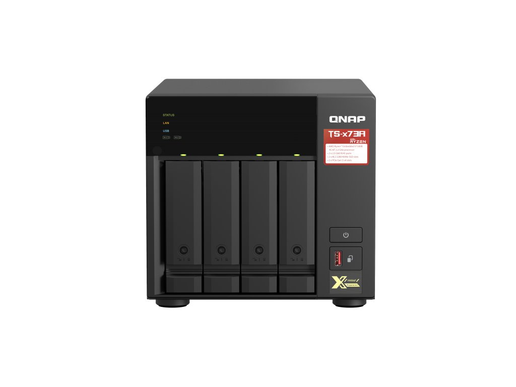 *Oba porty 2,5 GbE jsou zpětně kompatibilní s rychlostmi 1GbE / 100MbE. Přenosové rychlosti portů lze dosáhnout až 5 Gb / s. *Přidejte další funkce pomocí karet PCIe, včetně portů 10GbE, ukládání do mezipaměti SSD, portů USB 3.2 Gen 2, bezdrátové sítě nebo Fibre Channel. *Podporuje základní grafické karty NVIDIA® pro zpracování videa nebo průchod GPU do virtuálních počítačů. *Dva sloty M.2 PCIe NVMe SSD pro technologii Qtier a SSD Caching umožňují neustálou optimalizaci úložiště. OBSAH BALENÍ *TS-473A*Ethernet Cable x 1*Power Cord x 1*Flat head screw (for 3.5'' HDD) x 12*Flat head screw (for 2.5'' HDD) x 12*M.2 SSD Heatsink x 2*Drive tray keys x 2*Quick Installation Guide (QIG) SPECIFIKACECPU*AMD Ryzen™ Embedded V1500B čtyř-jádrový 2.2 GHz procesorArchitektura CPU*64-bit x86Jednotka s pohyblivou řádovou čárkou*AnoŠifrovací modul*AnoSystémová paměť*8 GB SO-DIMM DDR4 (1 x 8 GB) Maximální paměť*64 GB (2 x 32 GB) Paměť Flash*5GB (Dual boot OS protection) Pozice pro diskové jednotky*4 x 3.5-inch SATA 6Gb/s, 3Gb/sKompatibilita diskových jednotek*3,5'' SATA jednotky pevných disků*2,5'' SATA jednotky pevných disků*2,5'' SATA SSD Vyměnitelné za provozu*Ano Podpora akcelerace SSD cache*AnoM.2 SSD Slot*2 x M.2 2280 PCIe Gen3 x1 sloty2.5 Gigabit Ethernet Port (2.5G/1G/100M)*2Probuzení přes LAN *Ano Rámec Jumbo*Ano PCIe Slot*2x PCIe Gen 3 x4USB 3.2 Gen 2 (10Gbps)*3 x Type-A USB 3.2 Gen 2 5V/1A 10Gbps*1 x Type-C USB 3.2 Gen 1 5V/1A 5GbpsIR sensor*AnoTvarový činitel*TowerIndikátory LED*Napájení, stav, LAN, USB, Drive 1-4, M.2 SSD 1-2Tlačítka*Napájení, reset, Automatické kopírování na USB Rozměry (V x Š x H) *188.2× 199.3 × 280.8 mm Hmotnost (čistá) *5.03 kg Hmotnost (celková) *6.04 kg Provozní teplota*0 - 40 °C (32°F - 104°F) Relativní vlhkost*Relativní vlhkost 5 až -95 %, bez kondenzace, teplota vlhkého teploměru: 27 ?C (80,6 ?F) Napájecí jednotka*Adaptér 250W, 100-240 V, 50-60Hz, 3.5ASpotřeba energie: Režim spánku HDD*19,576 W Spotřeba energie: Provozní režim, typický. S plně obsazenými jednotkami*29,792 W Ventilátor*Systém: 1 x 120 mm*CPU: 1 x 60mmZvuková hladina*21,4 db(A) Systémové varování*Bzučák Více informací se dozvíte na stránkách výrobce