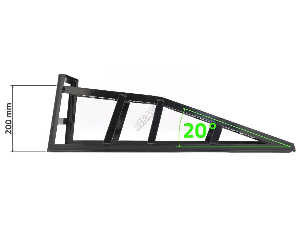 Rampa je vyrobená z pevnej ocele so stabilnou konštrukciou doplnenou o husté výstuhy a bezpečnostné prvky, ktoré zabezpečujú spoľahlivé zaťaženie až do 1000 kg na kus (2000 kg na pár). Nájazdová plocha s uhlom približne 20° umožňuje pohodlný výjazd vozidla.