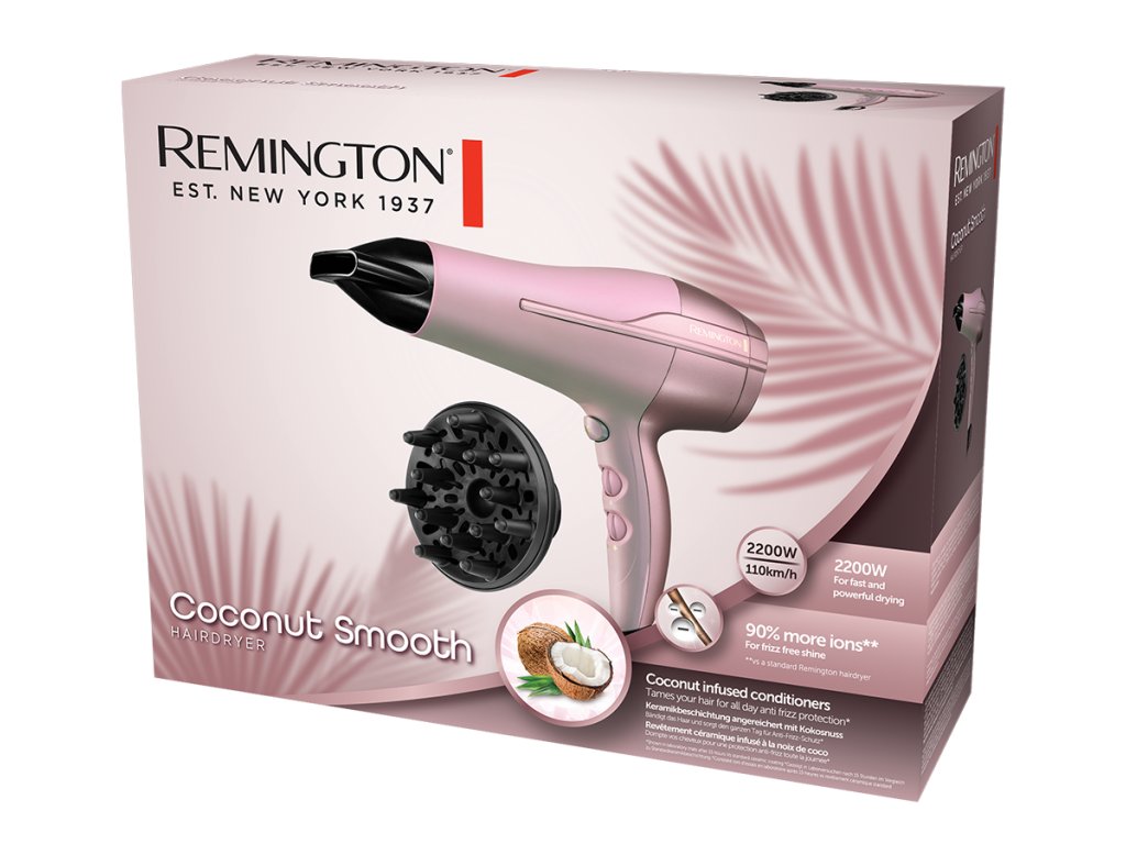 So sušičom na vlasy Coconut Smooth si ľahko vyfénujete krásny účes, ktorý vydrží bez krepovania celý deň*. Zdokonalený krúžok s mikrokondicionérmi obohatenými kokosom vám umožní vytvárať perfektne hladké účesy, a navyše chráni vaše vlasy pred každodennou lámavosťou. Zdokonalený krúžok s mikrokondicionérmi obohatenými kokosom na celodennú ochranu proti krepovaniu* Ionizácia – o 90 % viac iónov**