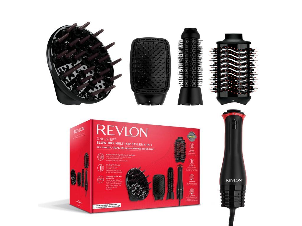 Túžia vaše vlasy po zmene? Revlon One-Step Blow-Dry Multi Air Styler 4v1 je multifunkčný teplovzdušný kulmofén 4v1, ktorý suší a tvaruje vlasy v jednom kroku. Tento teplovzdušný styler na vlasy sa stane vaším každodenným pomocníkom pri úprave jemných, hustých aj nepoddajných vlasov. V balení nájdete štyri vymeniteľné nadstavce pre objemný vyfúkaný efekt, prirodzené vlny, hladký rovný účes aj definované kučery.