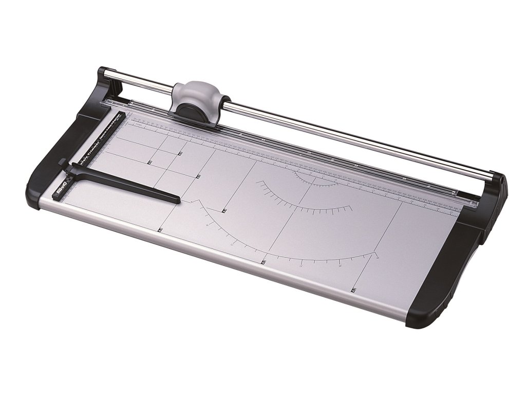 Kvalitní kolečková řezačka s pevnou kovovou základnou a řeznou hlavou umístěnou na kovové tyči, určena pro formát A2. Pracovní stůl je vybaven natištěnými měřítky a posuvnou zarážkou souběžnou s přímkou řezu. Díky rotačnímu noži z tvrzené nerezové oceli jsou řezačky KW Trio vhodné pro řezání i více listů nebo archů. K dispozici je náhradní řezné kolečko nebo celá řezná hlava. PARAMETRY: • Typ řezačky: kolečkové • Typ řezu: rovný • Délka řezu: 670 mm • Maximální formát: A2 • Uložení řezné hlavy: kluzné • Maximální tloušťka řezu: 1,2 mm • Maximální kapacita řezu: 12 listů / 70g papíru • Přítlak stohu papíru: automaticky • Rozměry pracovní desky: 315x670 mm • Předkreslené formáty na pracovní desce: A6-A3 • Rozměry (Š x V x H): 856mm x 100mm x 370mm • Hmotnost: 5.5 kgDodatočné parametre