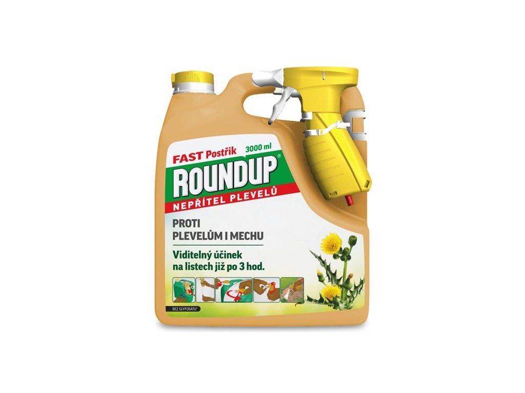 ROUNDUP FAST je neselektivní herbicidní přípravek bez glyfosátu určený k likvidaci nežádoucích širokolistých a trávovitých plevelů. Likviduje také mechy. ROUNDUP FAST je určen k okamžitému použití bez nutnosti ředění - tekutinu je nutné pouze přelít do nádoby s postřikovačem. Přípravek obsahuje účinnou látku na přírodní bázi - kyselinu pelargonovou s velmi rychlým vizuální efektem. Již 3 hodiny po aplikaci plevel vadne. Po třech dnech od aplikace můžete do půdy bez obav vysadit nové - žádoucí rostliny (pěstování následných plodin je bez omezení).