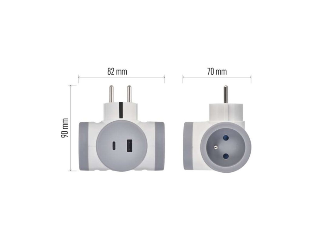 Rozbočovacia zásuvka 2×, 1×USB-A+1×USB-C, bielo-sivá