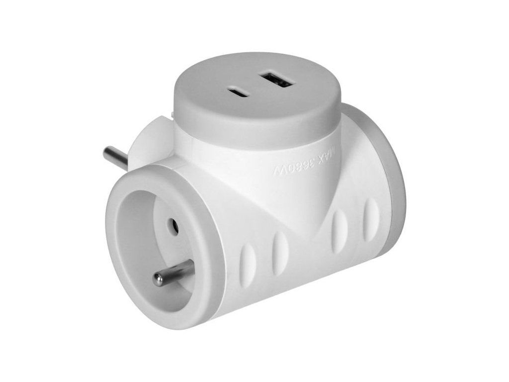 Elektrický rozbočovač, ktorý umožňuje pripojenie dvoch elektrických zariadení a súčasne použitie dvoch portov USB (typ A a C).