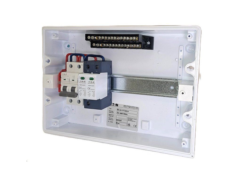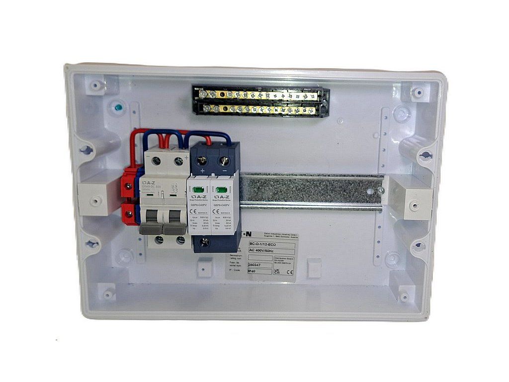 Kompletní certifikovaný DC rozváděč EATON včetně protokolu o zkoušce určený pro montáž na zeď, IP40 sloužící jako vstupní rozváděč od fotovoltaických panelů (ke střídači) při použití technologie pro ohřev vody, nebo FVE řetězců do 500 V DC.