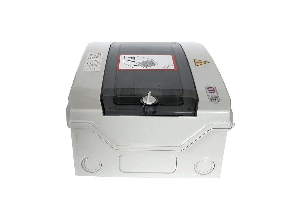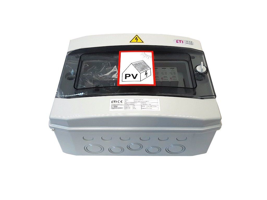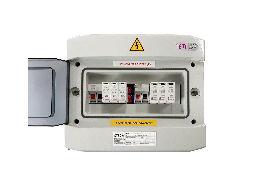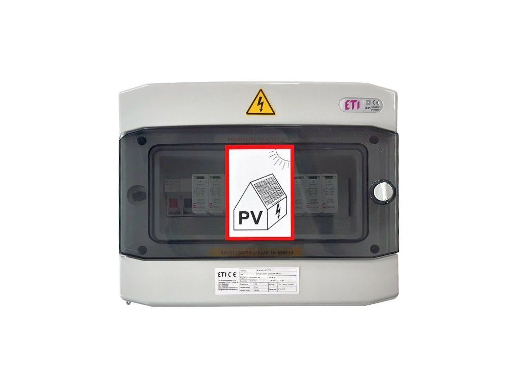 - Kompletní DC nástěnná rozvodnice pro FVE ETI RFVE-DC2-2-T12 2 stringy IP65 001105403 splňuje příslušné normy ČSN.
