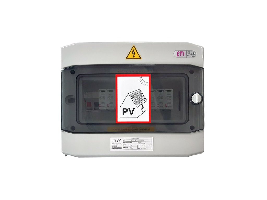 Kompletní nástěnná (určena pro povrchovou montáž) rozvodnice ETI RFVE-DC2-2-T12 je certifikována pro využití v rámci fotovoltaického systému. Je vybavena 2 svodiči přepětí T2 PV 1100/6.25 Y, 2 pojistkovými odpojovači DC 2P a 4 pojistkami 10 x 38 gPV 16A / 1000V.