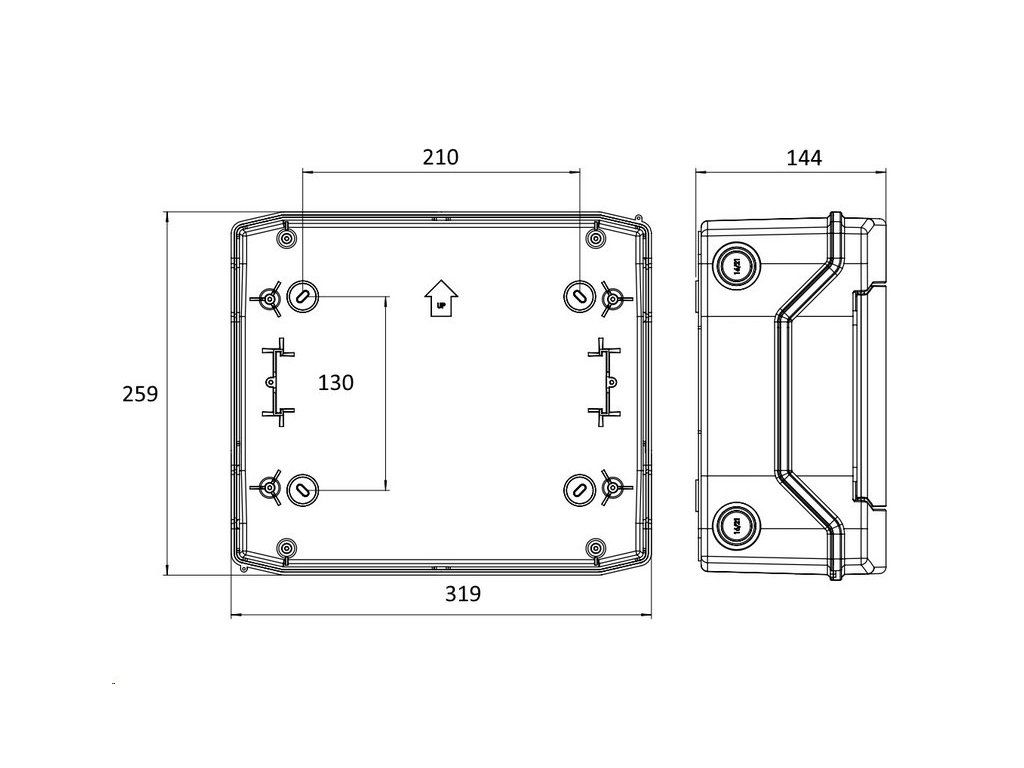 Rozměry kompletní DC nástěnného rozvodnice pro FVE ETI RFVE-DC2-2-T12 se 2 stringy IP65 jsou 256 mm x 319 mm x 144 mm.