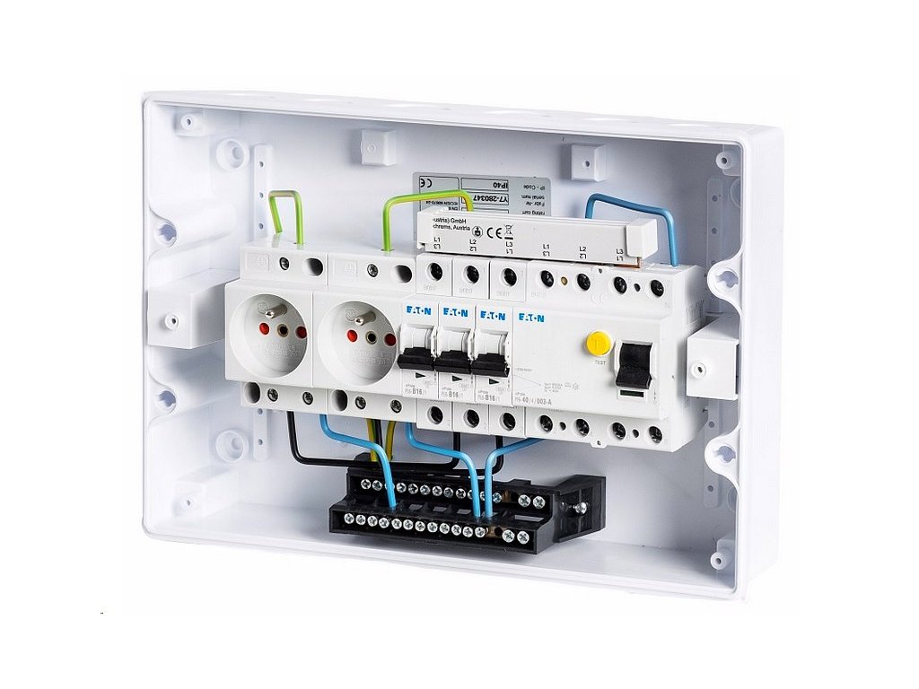 V rozváděči je osazen jistič B16/1 pro jištění dvou zásuvek a jedné rezervy pro samostatný spotřebič ze zálohy střídače a proudový chránič typu A.