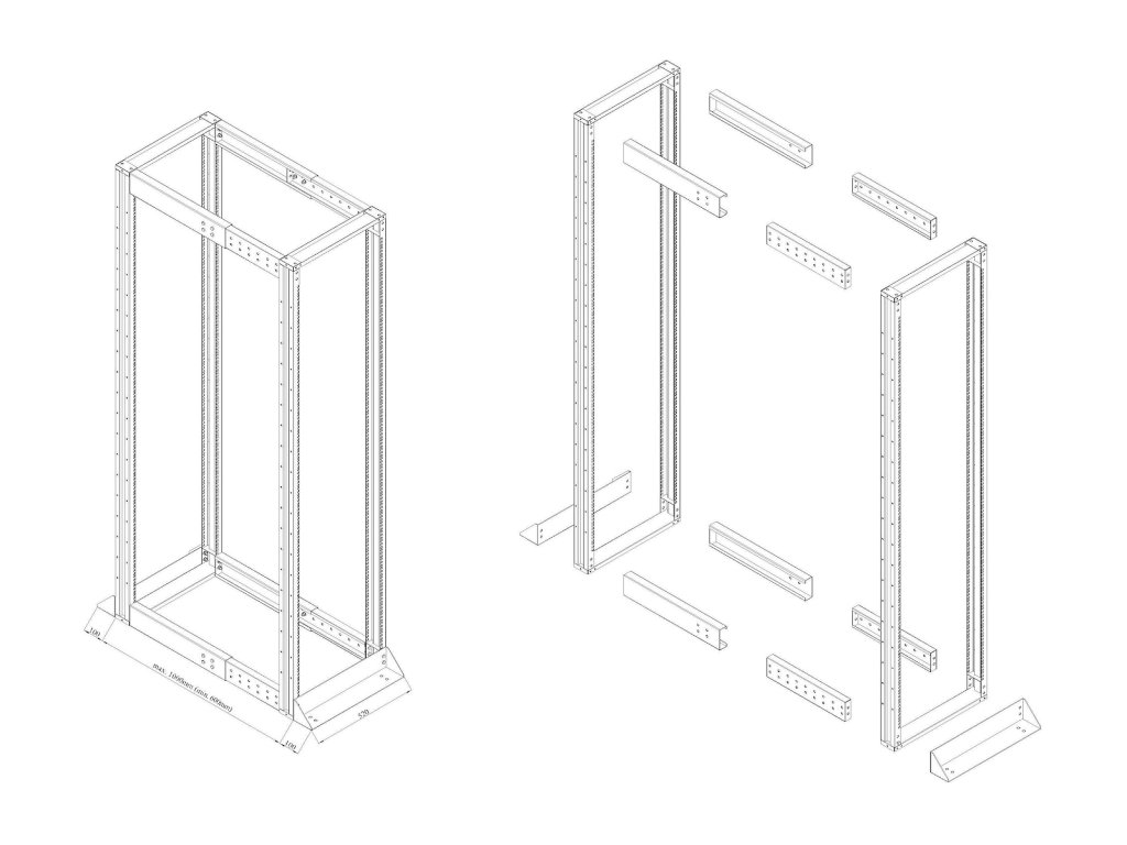 Rámy se vyznačují vysokou pevností, spolehlivostí a vynikajícím poměrem mezi kvalitou a cenou.Základním prvkem vysokonosného rámu je svařená 19“ konstrukce s posuvnými lištami v rozsahu 600 až 1 000 mm a nosností 1 200 kg.