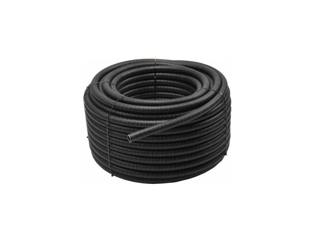 Inštalačná rúrka, vlnitá, ohybná, nehorľavá, vyrobená z čierneho PVC, s oceľovým pilotom uľahčujúcim ťahanie káblov.