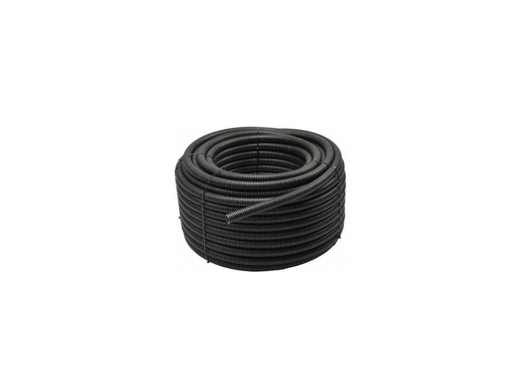 Inštalačná rúrka, vlnitá, ohybná, nehorľavá, vyrobená z čierneho PVC, s oceľovým pilotom uľahčujúcim ťahanie káblov.